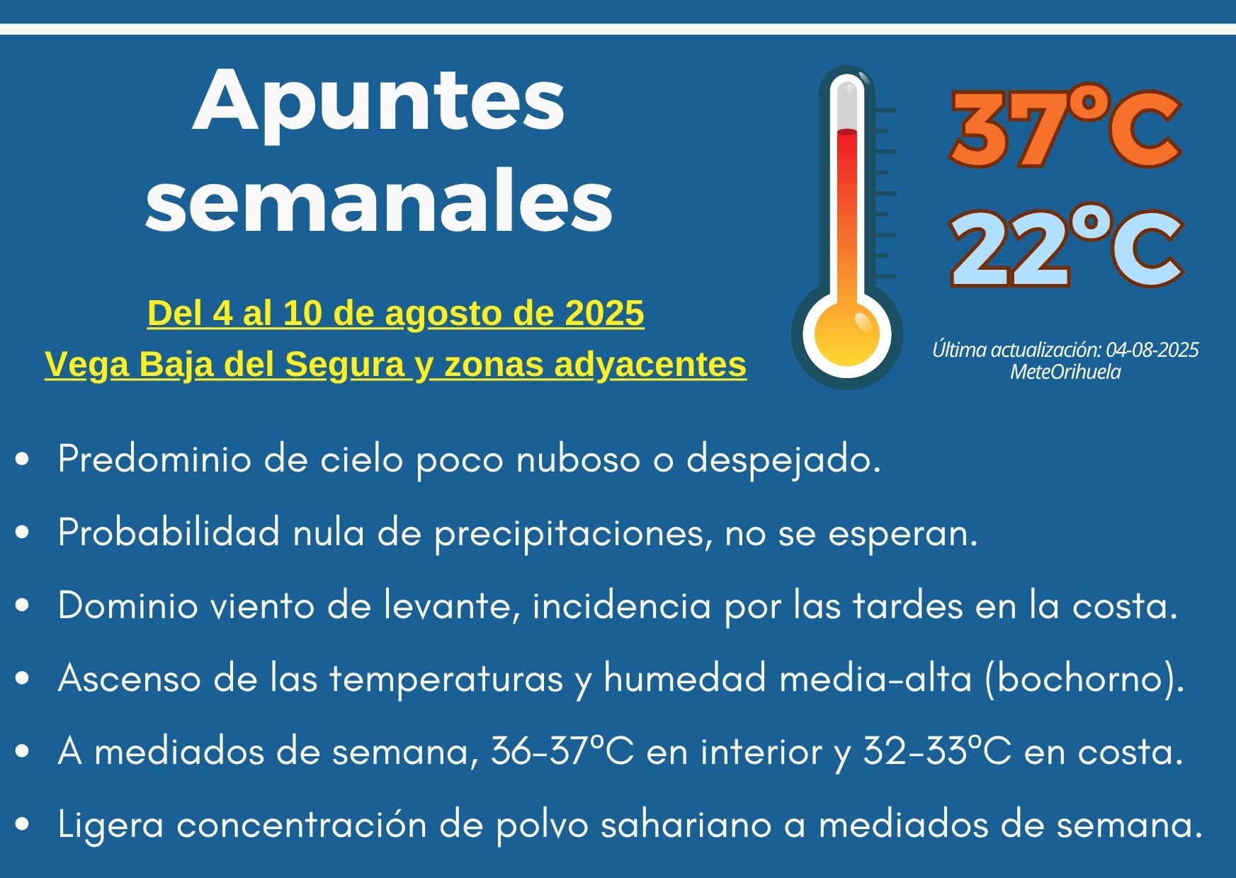 MeteOrihuela nos informa sobre el tiempo de esta semana en la que nos adentramos, del 4 al 10 de agosto, en la comarca de la Vega Baja y zonas adyacentes, donde nos adelanta que notaremos mucho más el calor durante estos días: