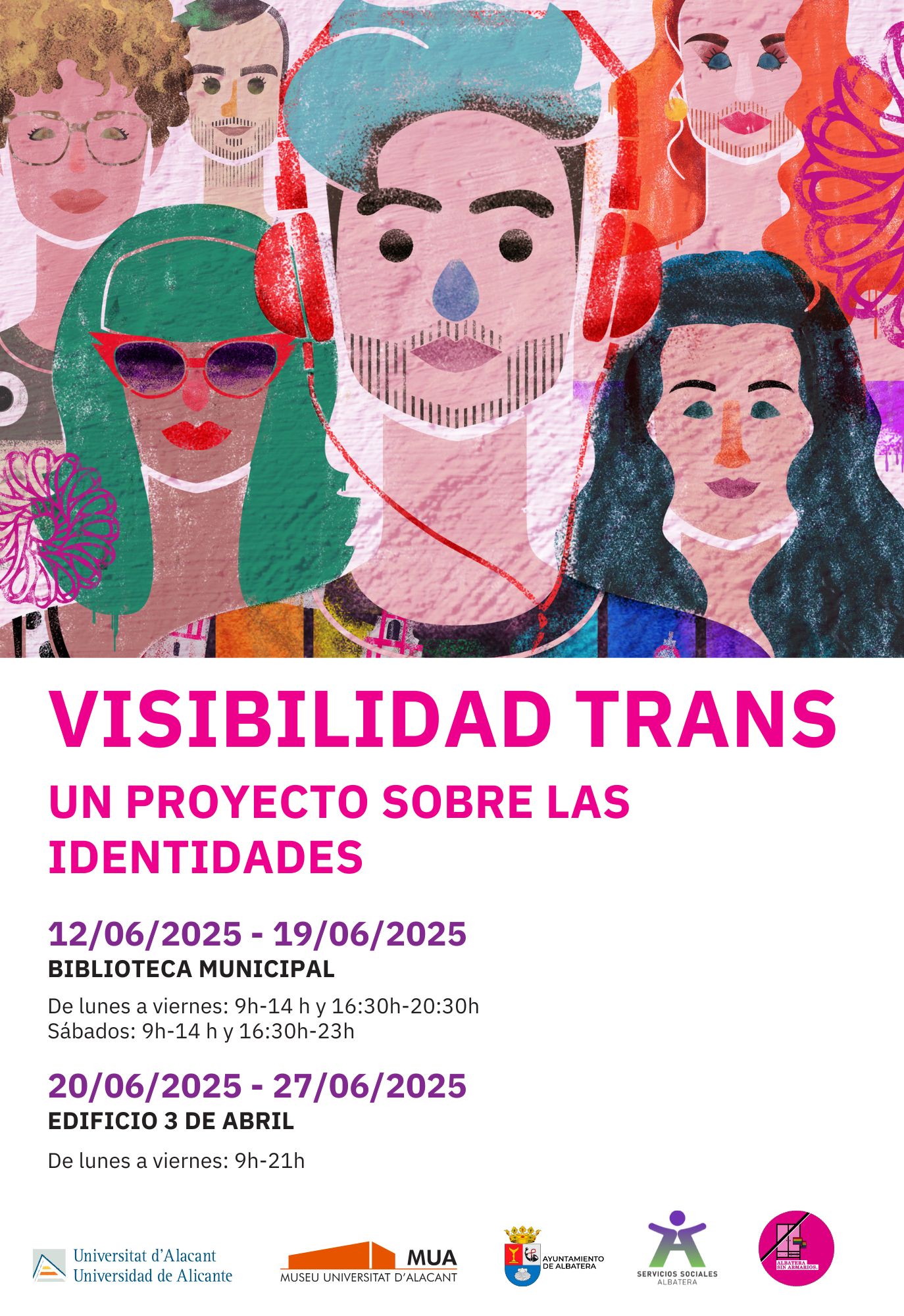 Del 12 al 27 de junio: Exposición “Visibilidad Trans: Un proyecto sobre las identidades”. Una muestra artística, resultado de un taller de arte urbano llevado a cabo en la Universidad de Alicante durante la Semana de la Visibilidad Trans, en colaboración con el colectivo Zeta, estará expuesto en: