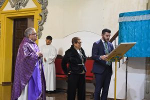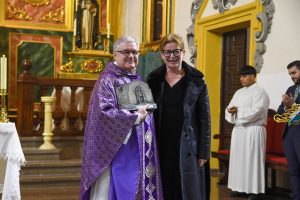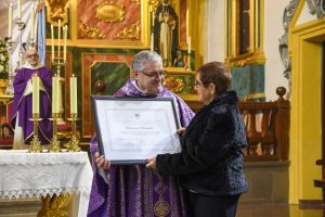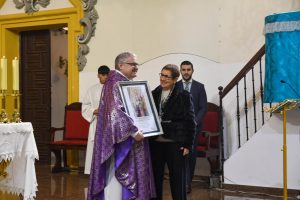 El dominico Fray Jesús Díaz Sariego, prior del Real Convento de Predicadores de Valencia, hizo entrega del reconocimiento a la hermana mayor Encarna Serna durante un emotivo acto celebrado en la Parroquia de Santiago Apóstol