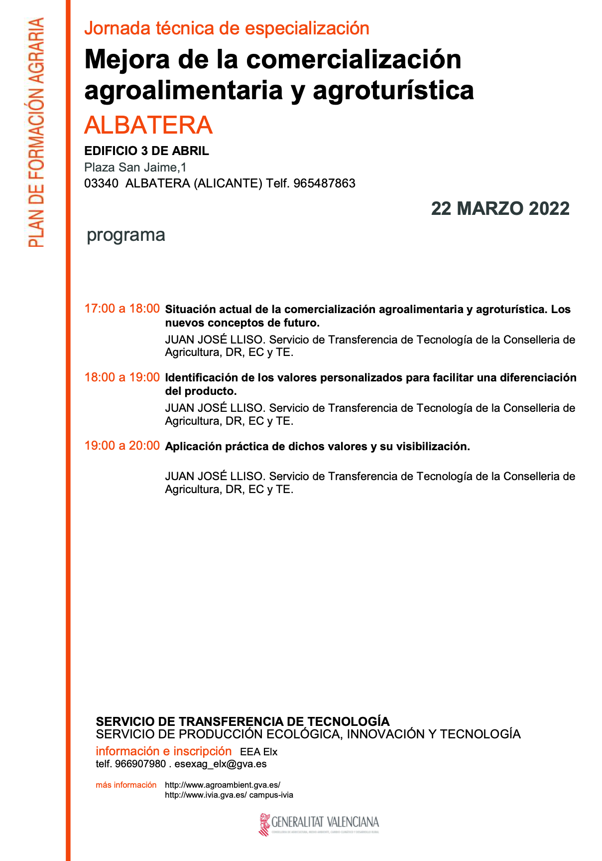 El curso será el 22 de marzo de 17:00 a 20:00 horas en el Edificio Municipal 3 de Abril. Durante la tarde habrán tres ponencias impartidas por Juan José Llisco, del Servicio de Trasnferencia de Tecnología de la Conselleria de Agricultura, DR, ER y TE. En ellas se tratarán diversos temas, como la situación actual de la comercialización agroalimentaria y agroturística y los nuevos conceptos de futuro, la identificación de los valores personalizados para facilitar una diferenciación del producto, y por último, la aplicación de practicas de dichos valores y su visibilización.