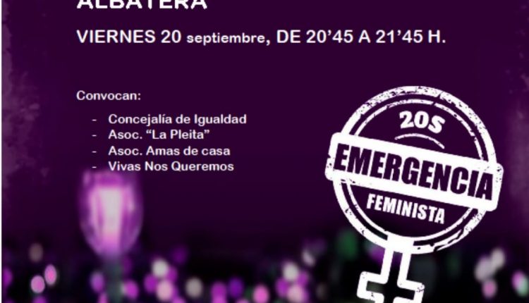 La concejalía de Igualdad junto con la Asociación de Mujeres Progresistas La Pleita, la Asociación Amas de Casa de Albatera y Vivas Nos Queremos han convocado una concentración nocturna para este viernes 20 de septiembre bajo el lema «la noche será violeta», sumándose así a las concentraciones que se han convocado en todo el país por Emergencia Feminista. Desde las 20:45 hasta las 21:45 está previsto que la luz violeta llegue a todos los rincones de la Plaza de España.
