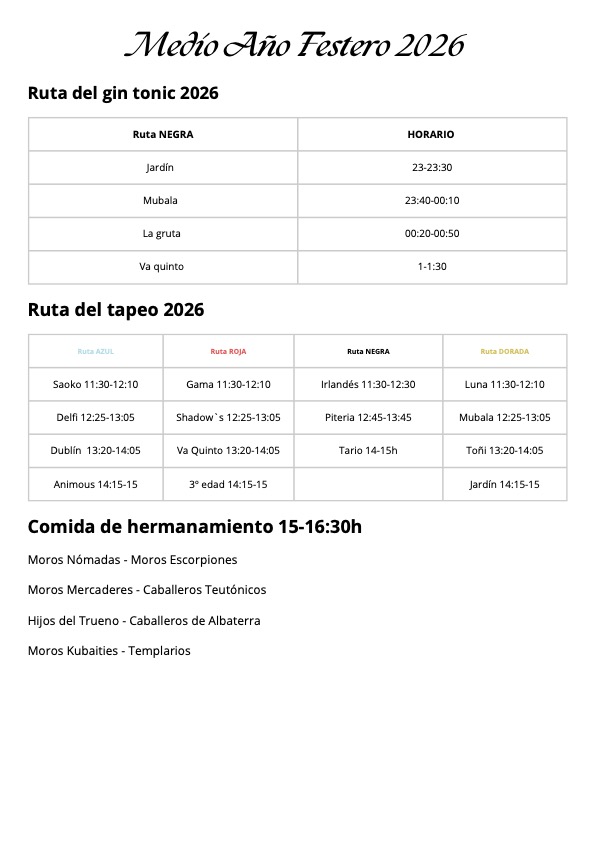 A partir de las 23:00 horas se celebrará la Ruta del Gin Tonic, que recorrerá algunos de los establecimientos participantes que esta edición son, Jardín, Va Quinto, La Gruta, Mubala, Animus, Irlandés y Shadow’s, dando inicio al ambiente nocturno del Medio Año Festero. Durante esta noche festera, una charanga acompañará a las comparsas, animando el recorrido y llenando las calles de música y ambiente.