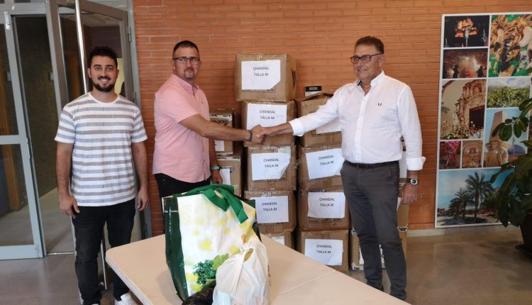 El presidente de la Federación de Fútbol de la Comunidad Valenciana, Salvador Gomar, hizo entrega al edil de Deportes, Alfredo Box, de material deportivo que se va a sumar a los numerosos kilos o productos de higiene y limpieza que se recogieron en el punto solidario instalado en la Casa de Cultura y que en los próximos días se trasladarán a las zonas afectadas por la gota fría en la Vega Baja.