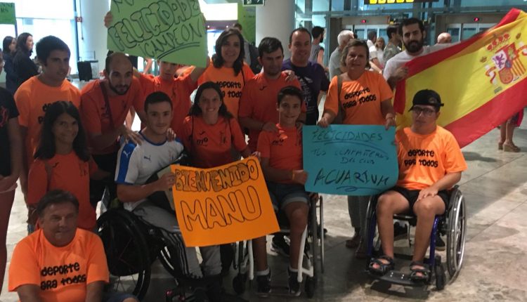 Una pequeña representación del club Aquarium CE ha recibido a Manuel Martínez a su llegada al aeropuerto de Alicante-Elche después de su participación en los Campeonatos Europeos de Natación Paralímpica disputados en Dublin del 13 al 19 de agosto.