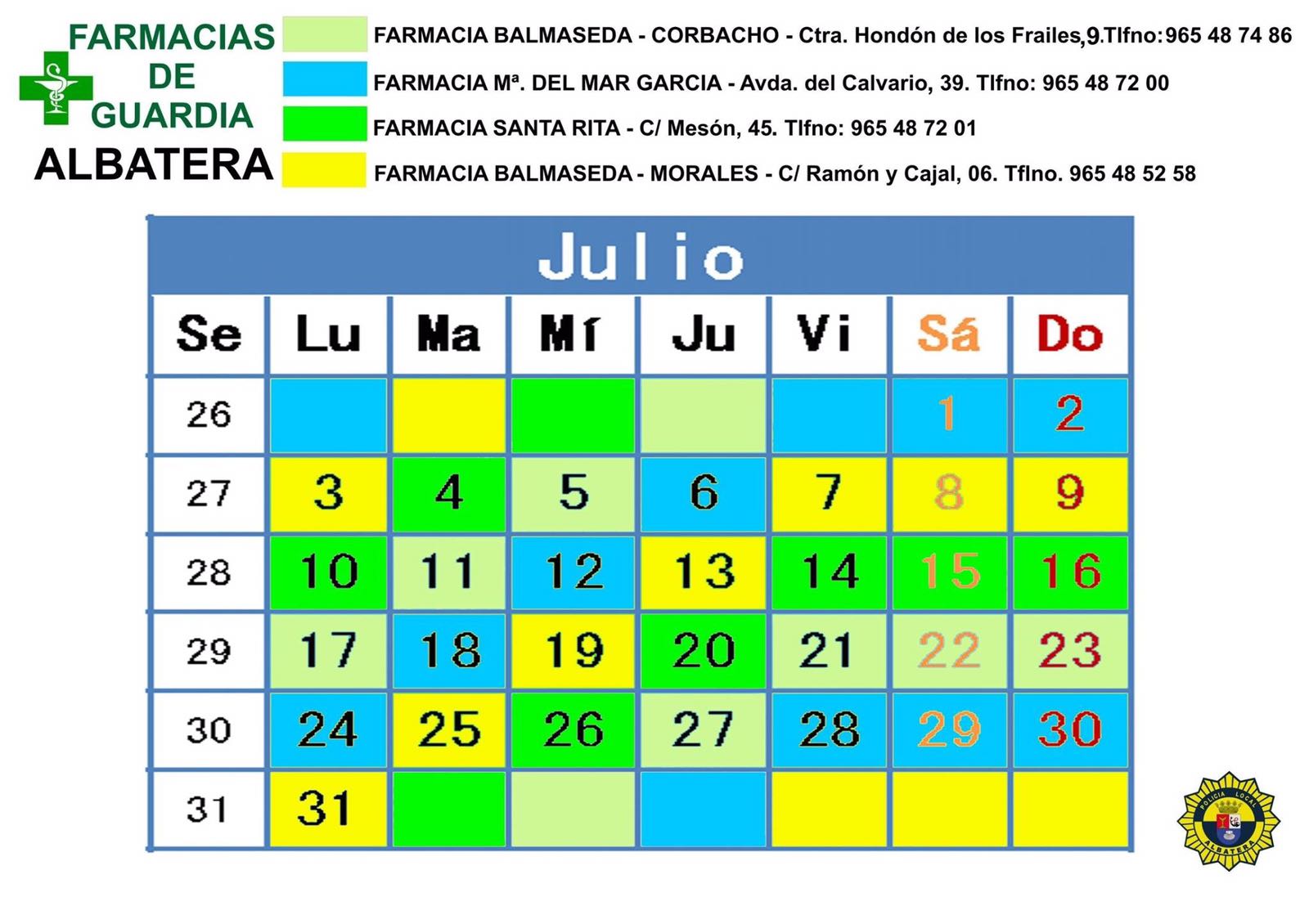 Como viene siendo habitual la Policía Local de Albatera publica a principios de cada mes los calendarios de las farmacias de guardia y los días que está prevista la recogida de enseres.