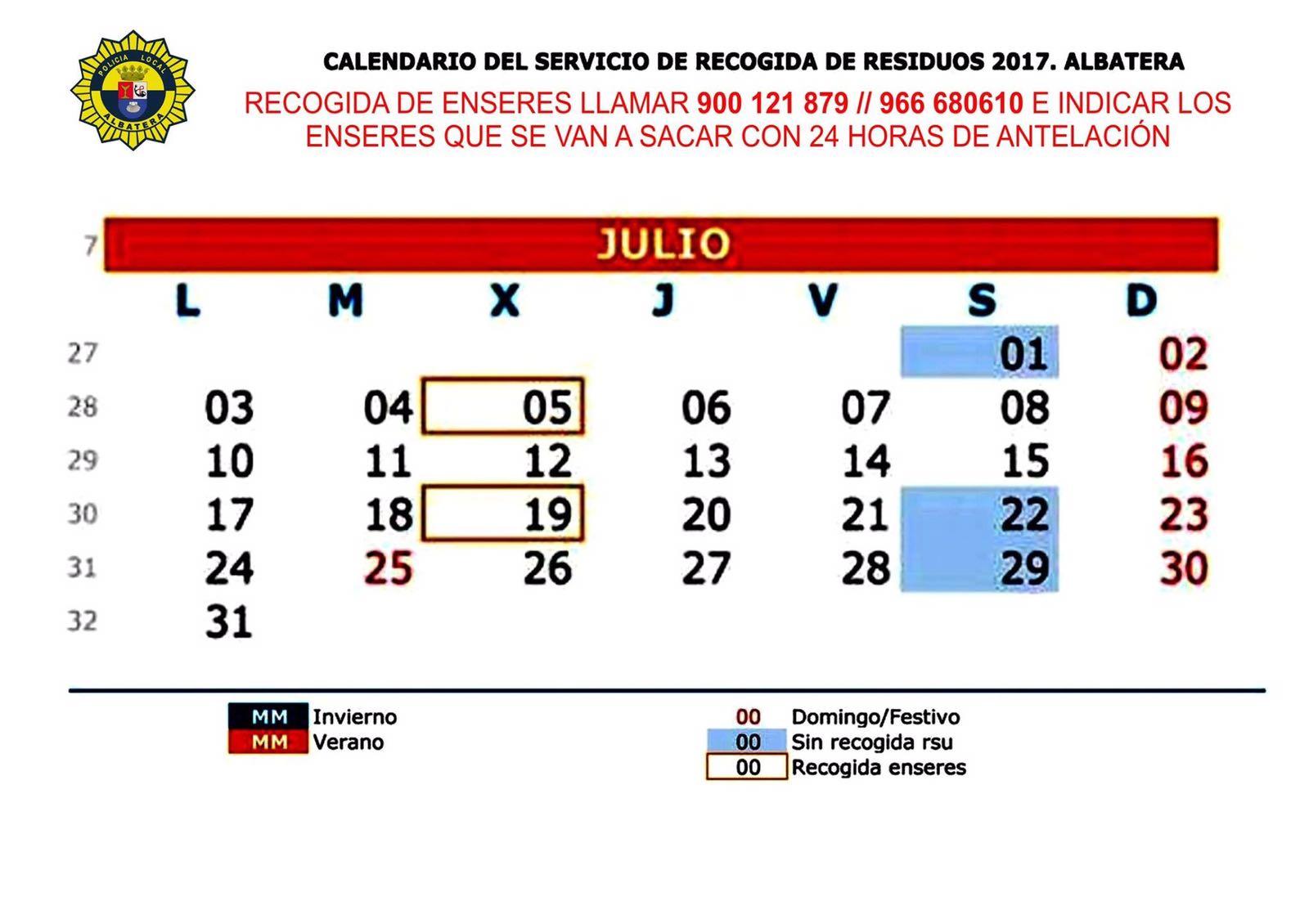 También se ofrece el calendario para informar de los días que tendrá lugar la recogida de enseres. Es necesario ponerse en contacto a través del teléfono 966 68 06 10 o 900 121 876, con 24 horas de antelación y avisar de los enseres que se van a sacar para su retirada.