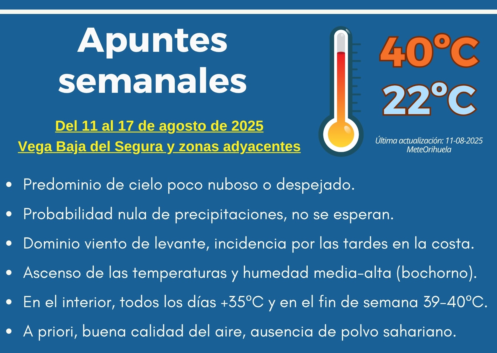 Una semana marcada por el tiempo estable y las altas temperaturas, así es el pronóstico de MeteOrihuela del 11 al 17 de agosto en la Vega Baja: