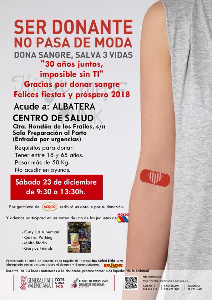 Este sábado 23 de diciembre, tienes una cita con la solidaridad. Además, en esta ocasión, para agradecerte tu donación, te llevarás un detalle de Valor, y podrás participar en en un sorteo de juguetes Moltó. Desde las 9:30 hasta las 13:30 puedes acudir al Centro de Salud de Albatera y colaborar con el Centro de Transfusiones de la Generalitat.