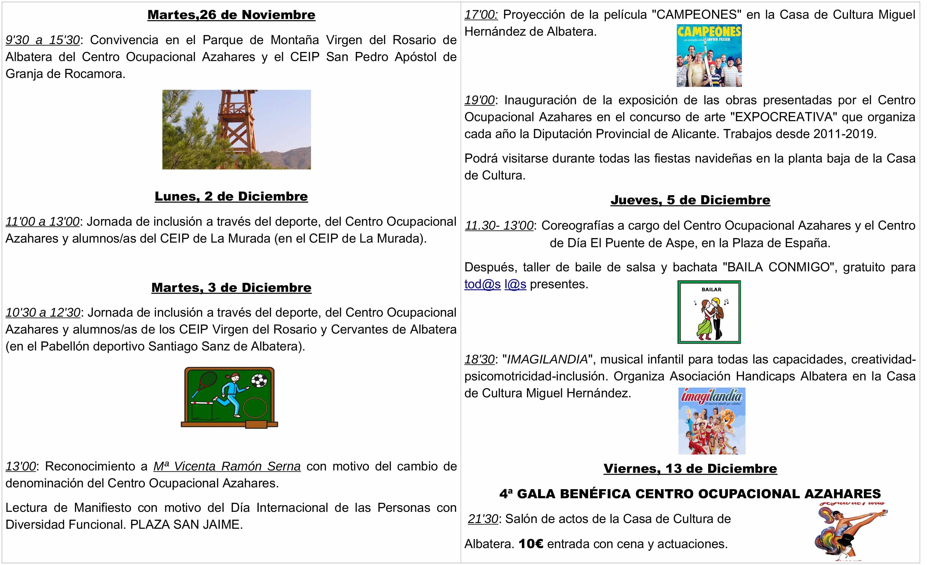 Con motivo de la Semana de la Discapacidad que se celebra en Albatera del martes, 26 de noviembre, al viernes, 13 de diciembre, el Ayuntamiento de Albatera a través de la concejalía de Bienestar Social que dirige José Antonio Berná y en colaboración con el Centro Ocupacional Azahares-Mª Vicenta Ramón y la Asociación Handicaps Albatera, ha organizado una serie de actividades que “tienen el objetivo de visibilizar y concienciar a los albaterenses sobre las necesidades de las personas con diversidad funcional para conseguir una Albatera 100% inclusiva” ha explicado el concejal, quién ha matizado que “este año 2019 el manifiesto de la Asociación Handicaps gira en torno a la soledad de las personas don diversidad funcional”.