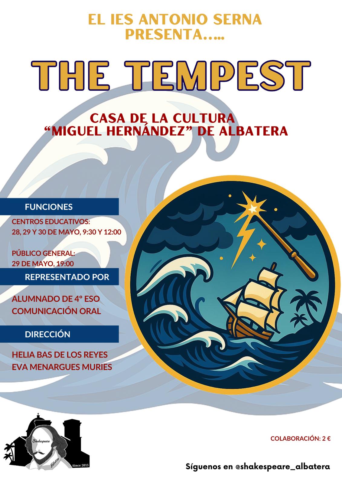 El IES Antonio Serna de Albatera vuelve a subirse al escenario con una nueva propuesta teatral: “The Tempest” (“La Tempestad”), la última obra escrita por William Shakespeare. Esta representación, en inglés original, tendrá lugar los días 28, 29 y 30 de mayo en la Casa de Cultura de Albatera.