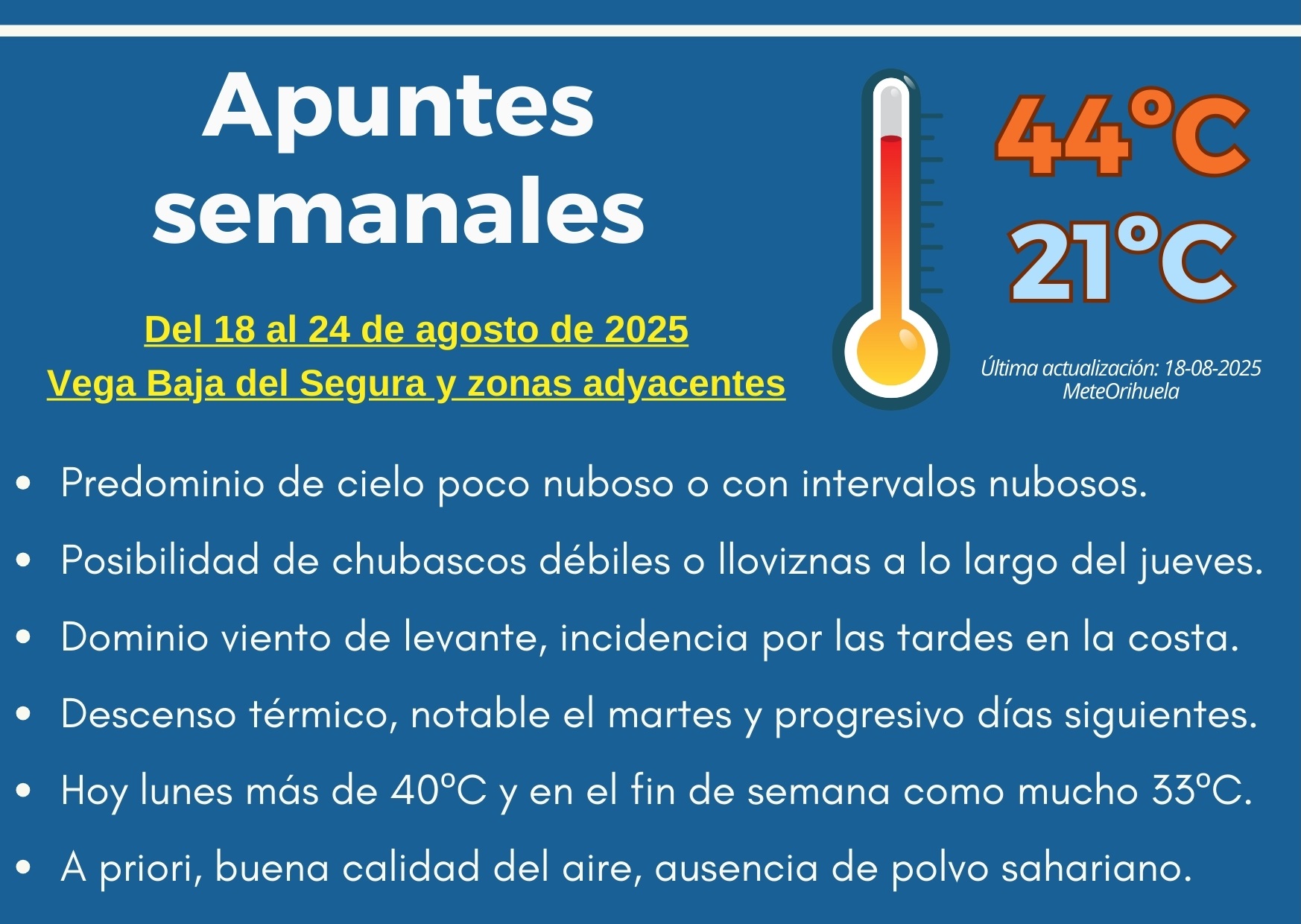 Tal como nos informa MeteOrihuela, este lunes, 18 de agosto, volvemos a registrar temperaturas extremas en la comarca de la Vega Baja, con valores que en amplias zonas superarán los 40 °C y picos locales que alcanzarán los 43-44 °C. Un episodio sofocante que, según las previsiones de esta semana, empezará a remitir a partir del martes.