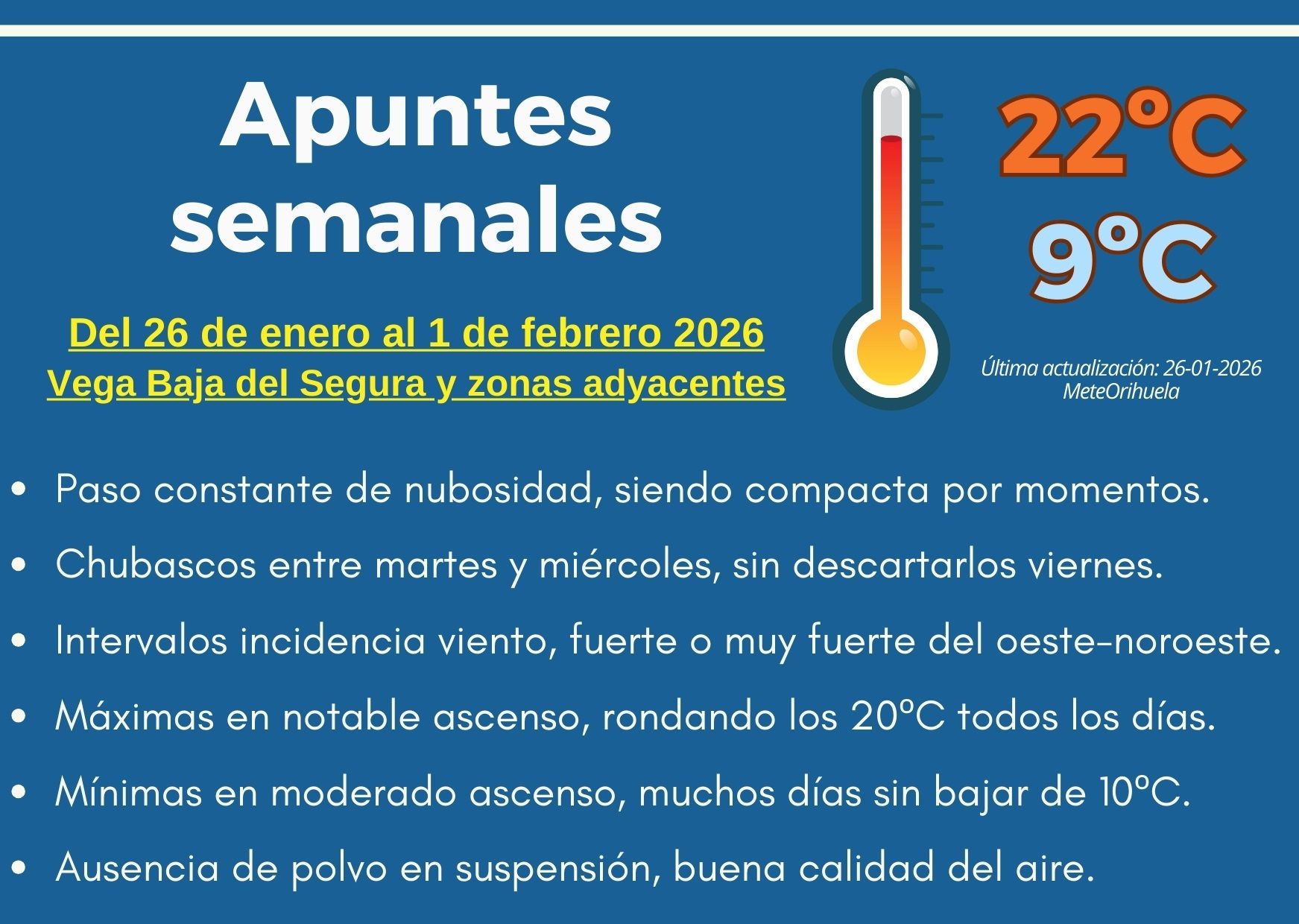 Albatera afronta la semana del 26 de enero al 1 de febrero con un tiempo marcado nuevamente por el viento, frente a unas precipitaciones escasas, y con un ambiente menos frío o más templado.