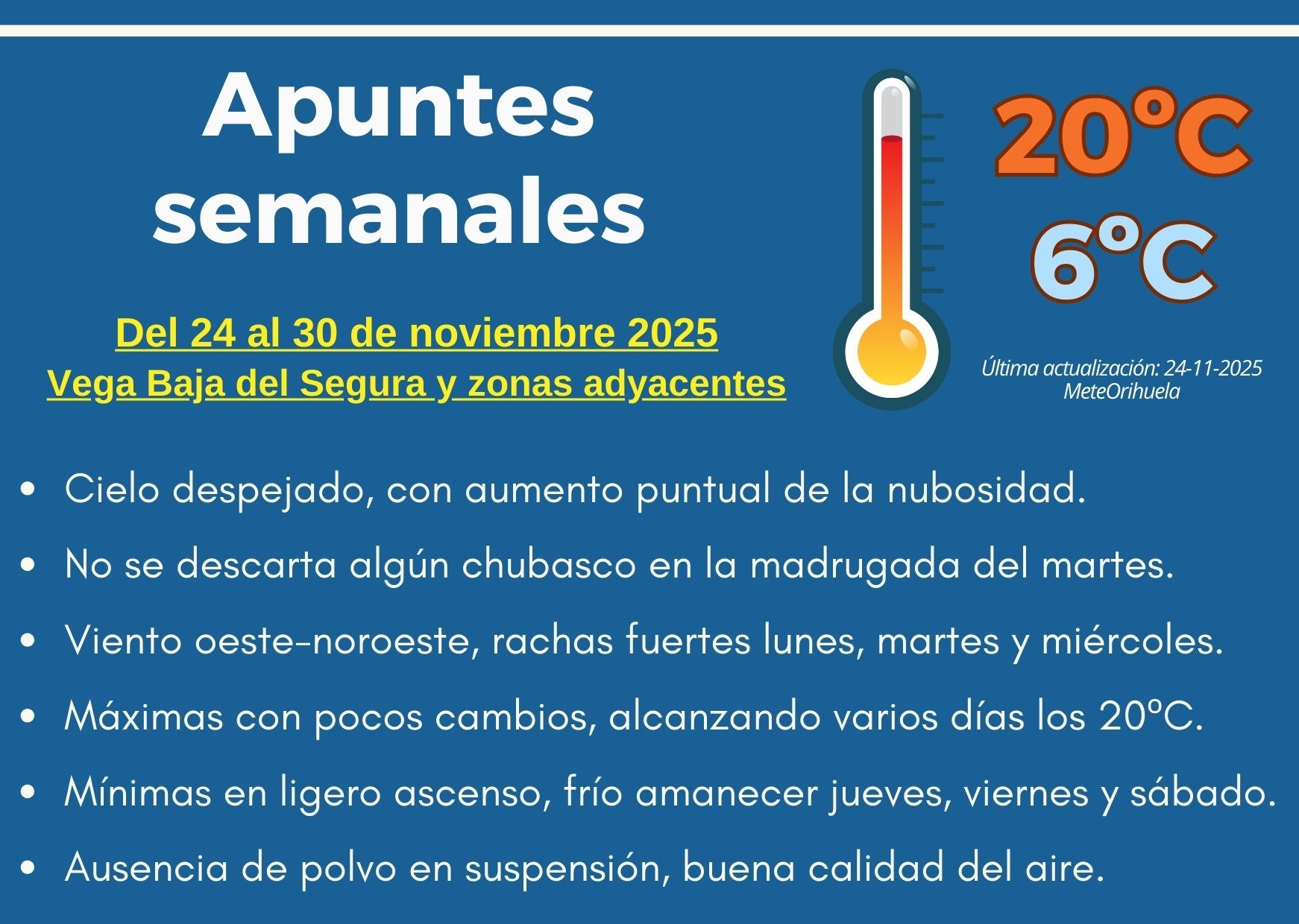 Albatera y sus zonas adyacentes registrarán, durante la semana, del 24 al 30 de noviembre, un predominio de cielos despejados, con algún aumento puntual de nubosidad. No se descarta la posibilidad de alguna gota aislada durante la madrugada del martes, según los últimos apuntes meteorológicos de nuestro compañero de MeteOrihuela.