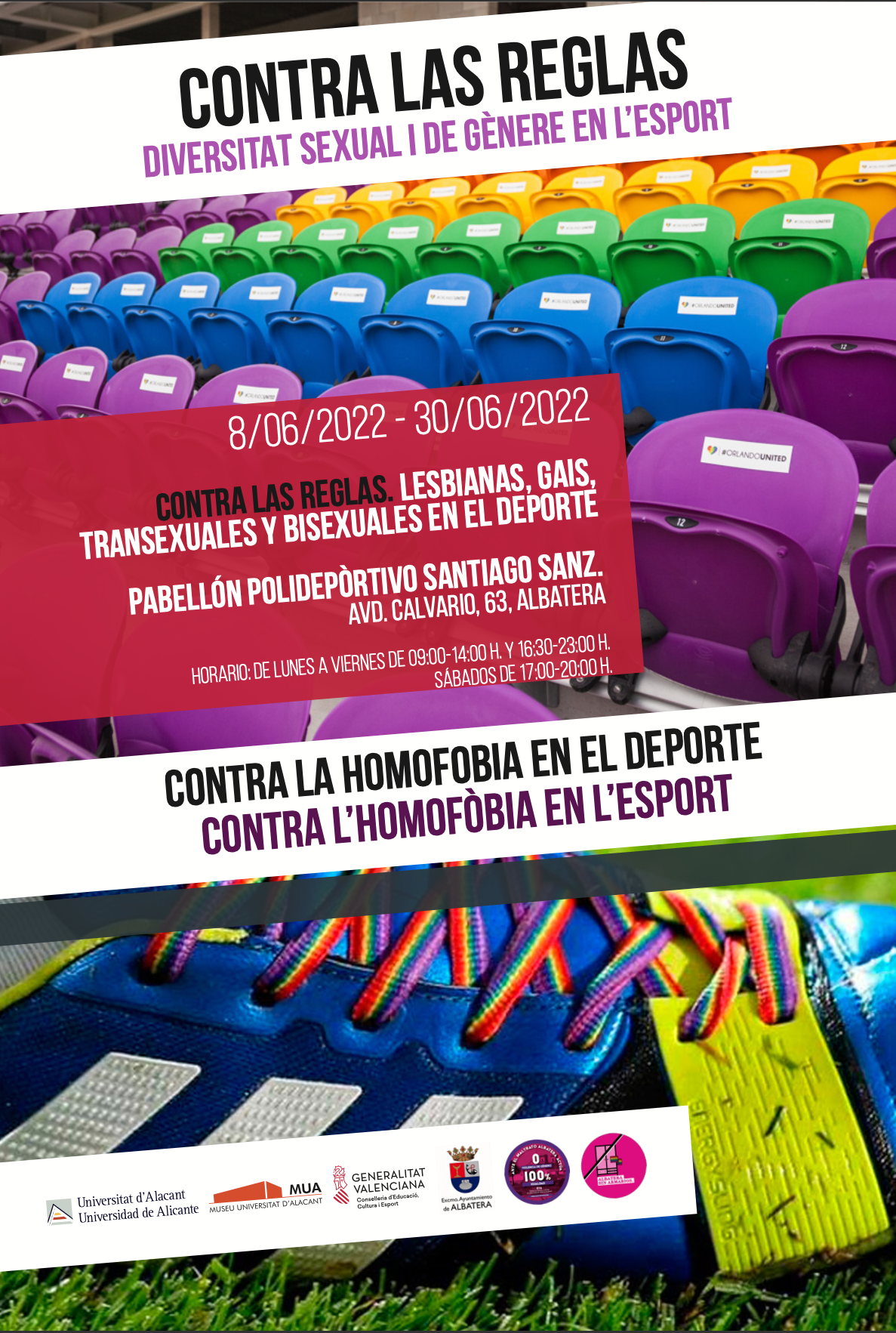 “Por un lado tenemos una exposición, Contra las reglas, donde todo el que la visite podrá recorrer la vida de algunos y algunas deportistas profesionales que pertenecen al colectivo LGTB y cómo ha influenciado esto en su carrera profesional”, ha explicado el edil. La exposición se encuentra en el Pabellón Santiago Sanz y se podrá visitar de lunes a viernes, hasta el 30 de junio, de 9:00 a 14:00 y de 16:30 a 23:00 horas, además de los sábados de 17:00 a 20:00 horas.