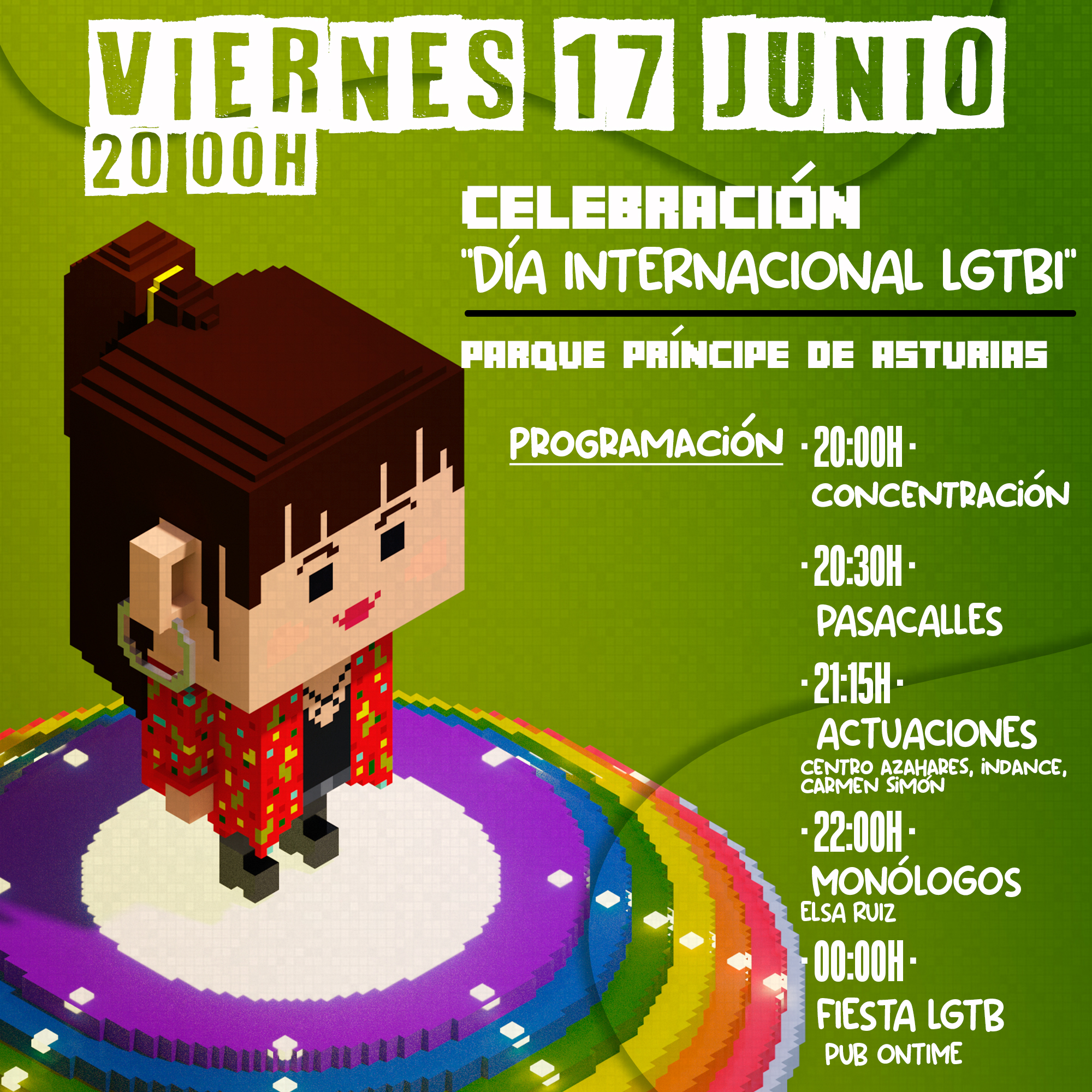 Por último, el gran día será el 17 de junio, donde se celebrará en la localidad el Día Internacional LGTBI con diversas actuaciones y actividades, todas ellas se harán en el Parque Príncipe de Asturias a partir de las 20:00 horas. Entre ellas destaca las actuaciones que nos ofrecerán Centro Azahares, Indance y Carmen Simón o el monólogo de Elsa Ruiz presentado por Nadin Nin a las 22:00 horas.