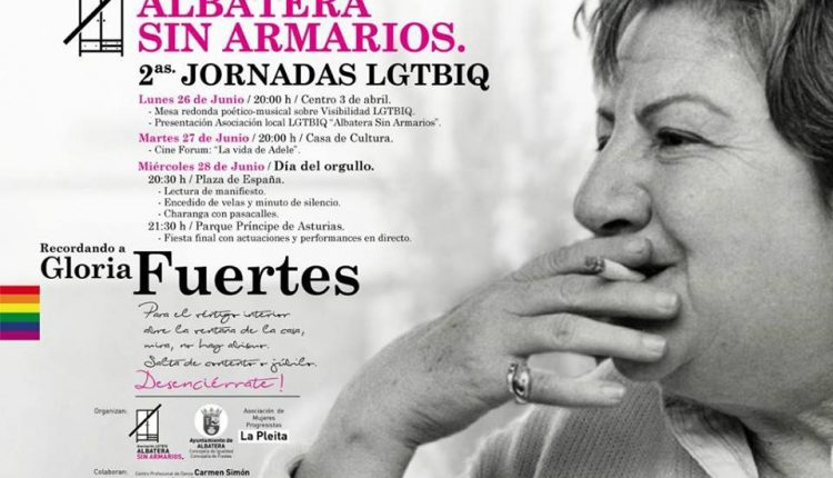 El lunes 26 de junio comienzan los actos previstos que este año homenajearán a la poetisa Gloria Fuertes en el centenario de su nacimiento. A las 20:00 de la tarde se llevará a cabo una mesa redonda en el centro 3 de abril. En esta mesa participarán “el colectivo LGTBI de Crevillente, el colectivo Diversa de Elx, y también Juan David, de la universidad de Alicante. En representación de Albatera estarán Dolo Sánchez y la concejala de igualdad Rosa Guillén”, nos informa Jaime Berná, integrante de la asociación LGTBI albaterense. Además en este acto también se presentará la Asociación Albatera Sin Armarios, de la que “ya están hechos los estatutos y después de la presentación, haremos legales los estatutos y constituiremos la asociación. Tenemos página en Facebook y quien quiera asociarse, colaborar o participar se puede poner en contacto con nosotros”. En este acto también se leerán algunas de las poesías más significativas de Gloria Fuertes, acompañadas por la música de Pascual Salinas a la guitarra.