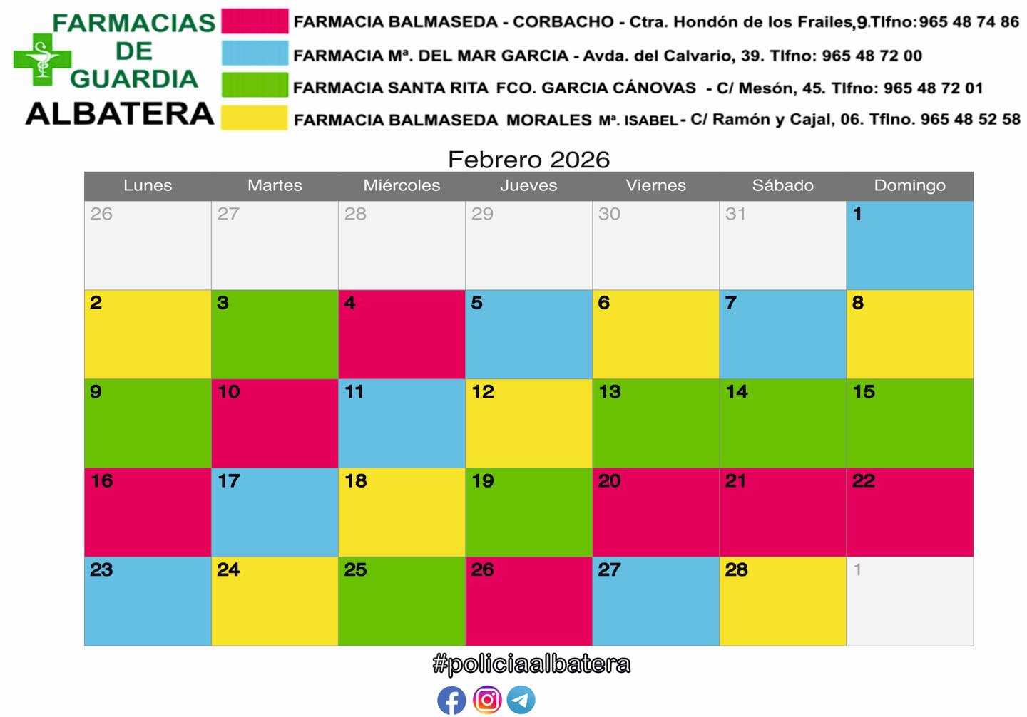 La Policía Local ha dado a conocer el calendario de farmacias de guardia correspondiente al mes de febrero de 2026, con el objetivo de garantizar a la ciudadanía el acceso a los servicios farmacéuticos durante todos los días del mes, incluidos fines de semana y festivos.