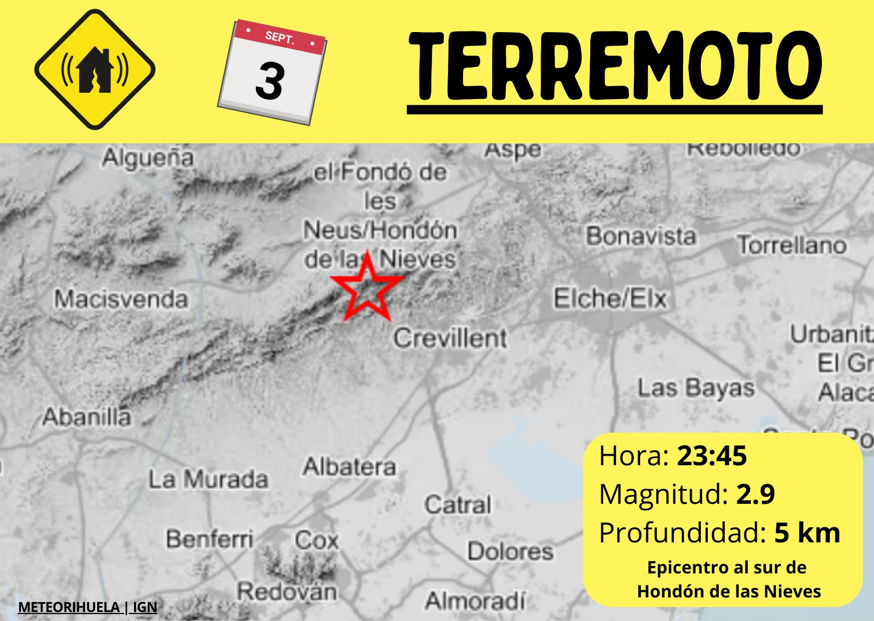 A las 23:45 horas del domingo, 3 de septiembre, se ha registrado un terremoto de magnitud 2.9 con epicentro en el Hondón de las Nieves que ha sido sentido por la población de Albatera, Crevillente y Elche.