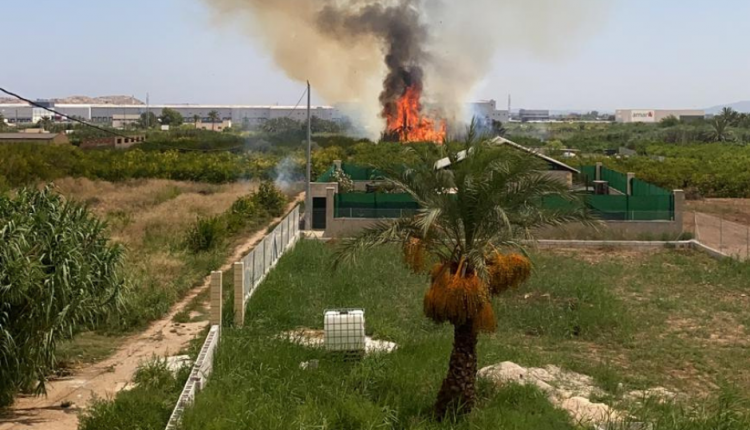 Este medio día se ha producido un incendio de palmeras, rastrojos y carrizos en la huerta de Albatera, entre la Av. de la Libertad y la Azarbe de Patricio.