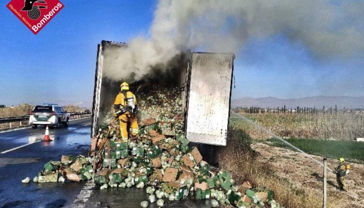 A las 9 horas de hoy, sábado, 3 de febrero, el consorcio provincial de Bomberos ha recibido el aviso de un incendio en el remolque de un camión de grandes dimensiones que transportaba verduras dentro del contenedor en la AP 7 en la salida de Catral.