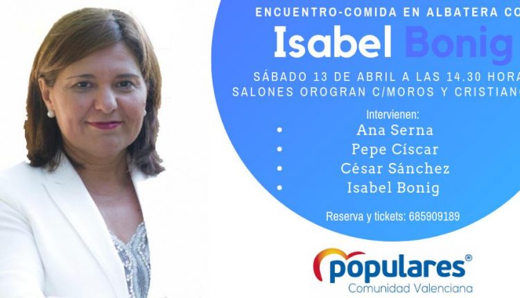 Este próximo sábado 13 de abril, Isabel Bonig,  presidenta y candidata del Partido Popular de la Comunidad Valenciana visitará Albatera para celebrar un encuentro-comida que se desarrollará en el restaurante Orogran y en el que podrá participar todo aquel que lo desee. Además, el acto contará con las intervenciones de Ana Serna, alcaldesa de Albatera, el presidente del Partido Popular de la Provincia de Alicante, Pepe Ciscar y el presidente de la Diputación Provincial de Alicante, César Sánchez.