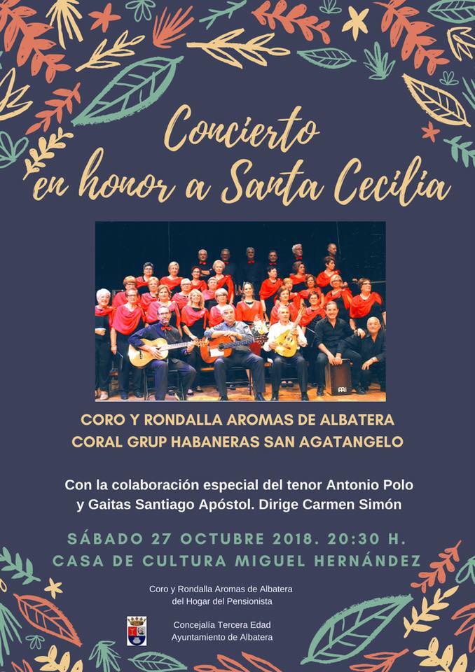Este sábado 27 de octubre, el Coro y Rondalla Aromas de Albatera ofrece un concierto en honor a Santa Cecilia y contará con la colaboración especial del tenor Antonio Polo y las gaitas de la Asociación Musical Santiago Apóstol bajo la dirección de Carmen Simón.
