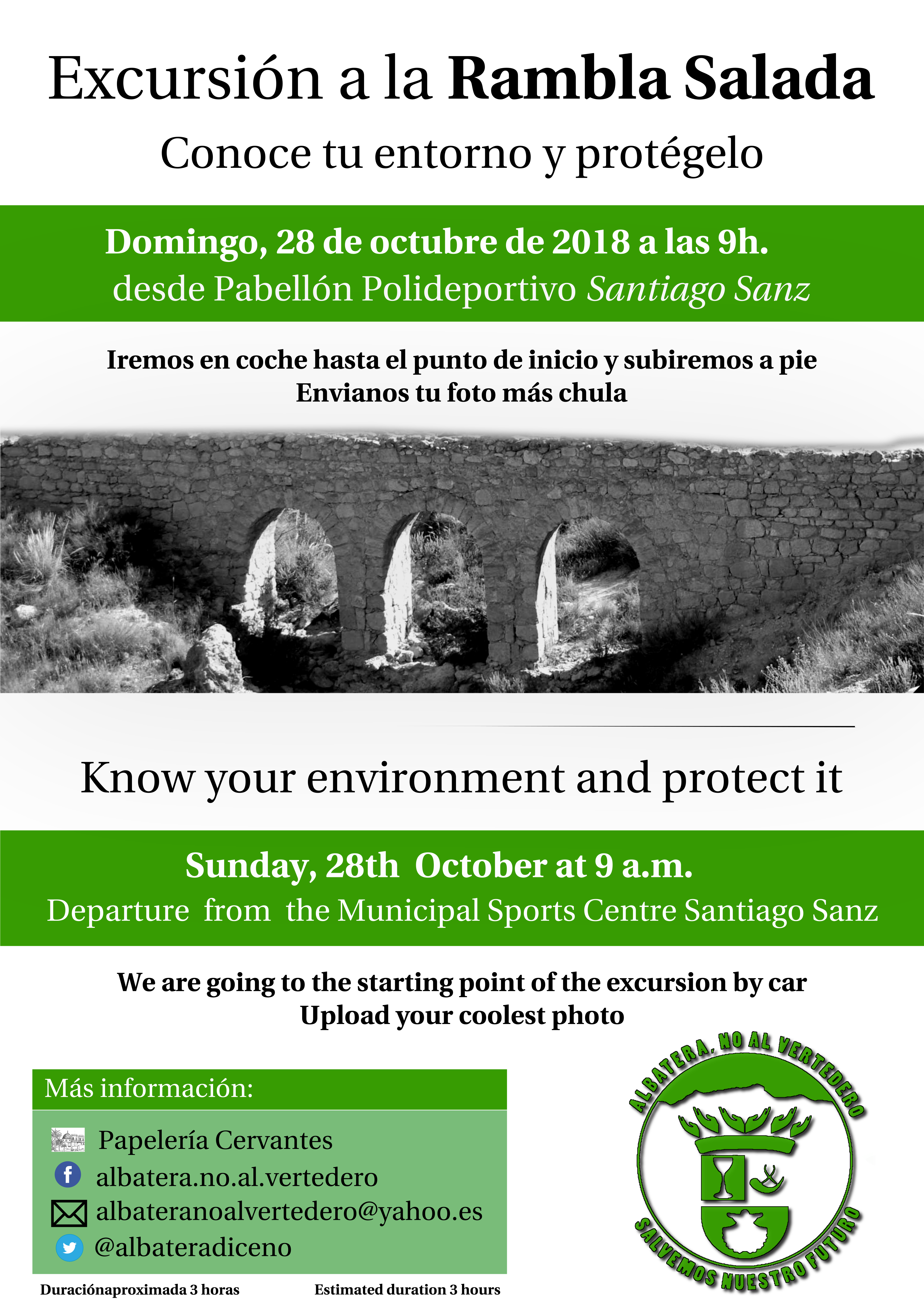 La asociación Albatera, No al Vertedero, ha organizado para este domingo día 28 de octubre una excursión a la Rambla Salada. El punto de encuentro será en el Pabellón Santiago Sanz de Albatera, a las 09:00h. Desde allí se partirá en coches hasta el punto de inicio de la excursión, que tendrá una duración aproximada de tres horas. Se recomienda llevar calzado, ropa adecuada y avituallamiento.