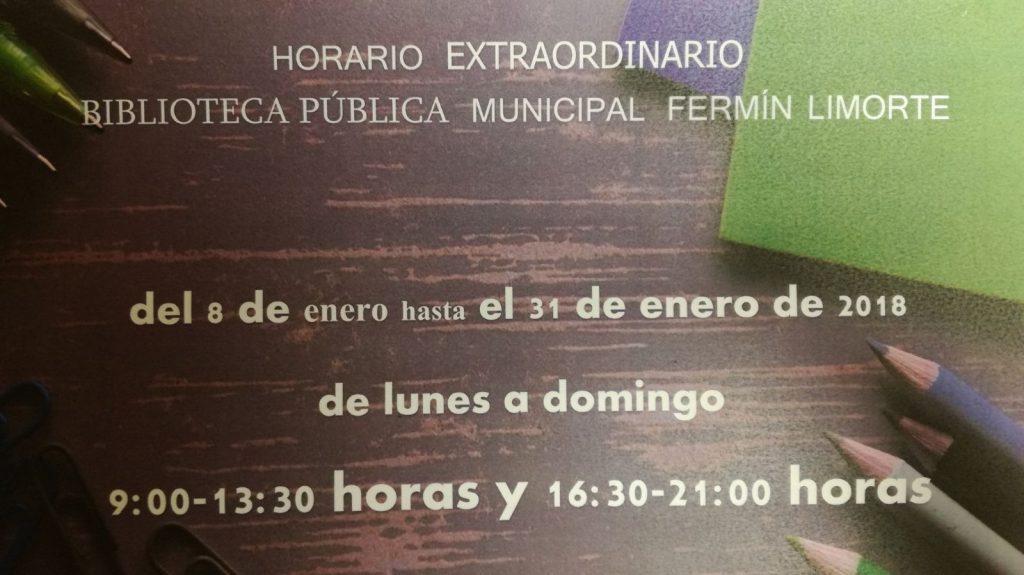 Conscientes de la necesidad del uso de las instalaciones municipales por parte de los estudiantes durante la época de exámenes, la Biblioteca Pública Municipal Fermín Limorte amplía su horario el mes de enero. De lunes a domingo permanecerá abierta de 9:00 a 13:30 y de 16:30 a 21:00 horas.