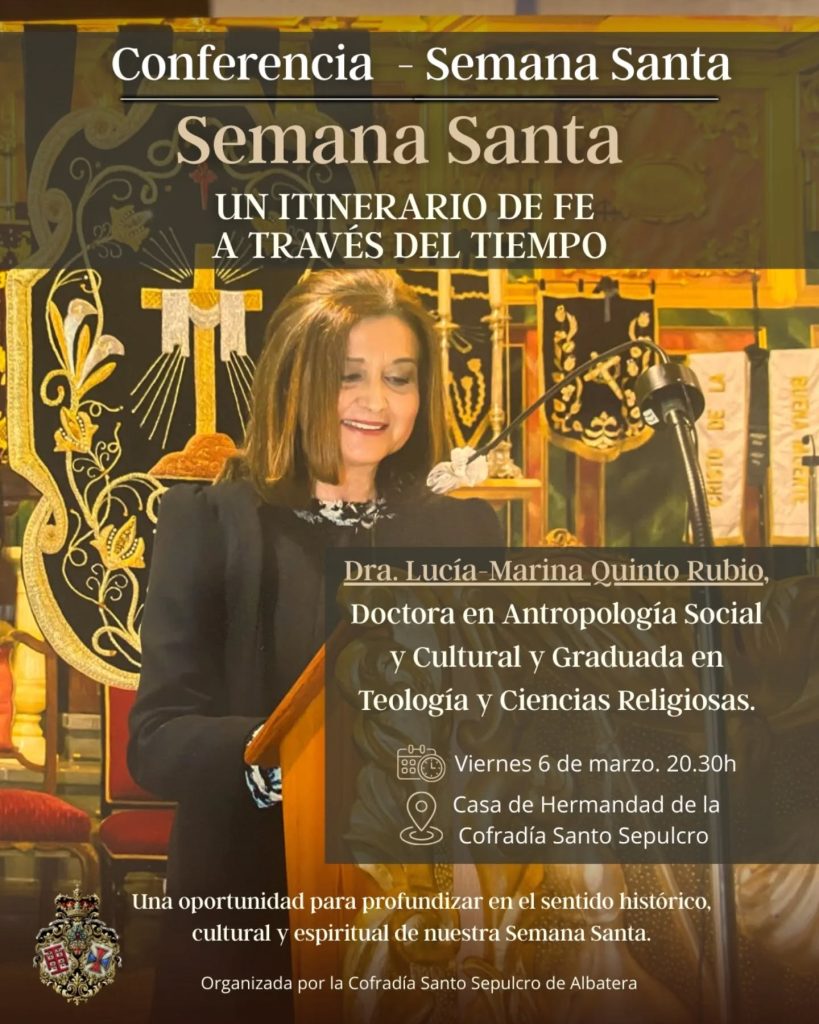 La ponencia estará a cargo de la Dra. Lucía-Marina Quinto Rubio, Doctora en Antropología Social y Cultural y Graduada en Teología y Ciencias Religiosas, quien ofrecerá una mirada rigurosa y reflexiva sobre la Semana Santa desde una perspectiva histórica, cultural y espiritual.