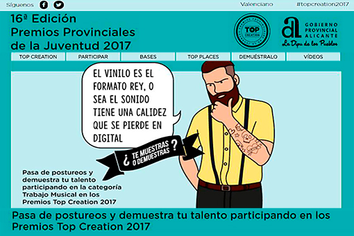 Con el objetivo de fomentar la creatividad y el talento de los más jóvenes, la Diputación de Alicante ha convocado un año más los Premios Top Creation. El certamen, dotado con 20.000 euros, cuenta en esta edición con las categorías Iniciativa Empresarial,Blogs, Iniciativa Coeducativa, Solista y Grupo Musical, Relato Breve y Fotografía Original.