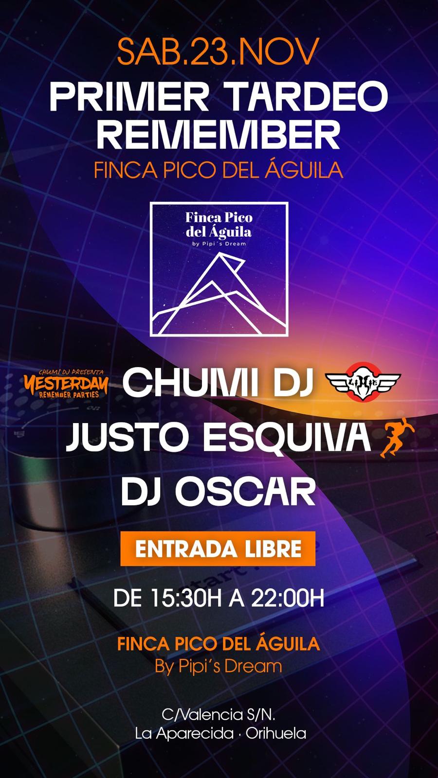 El sábado, 23 de noviembre, la Finca Pico del Águila contará con un ambiente único en su Primer Tardeo Remember. Una tarde diseñada para los amantes de la música remember que ambientará Chumi DJ, Justo Esquiva y DJ Oscar. El evento tiene entrada libre y se realizará de 15:30 a 22:00 horas.