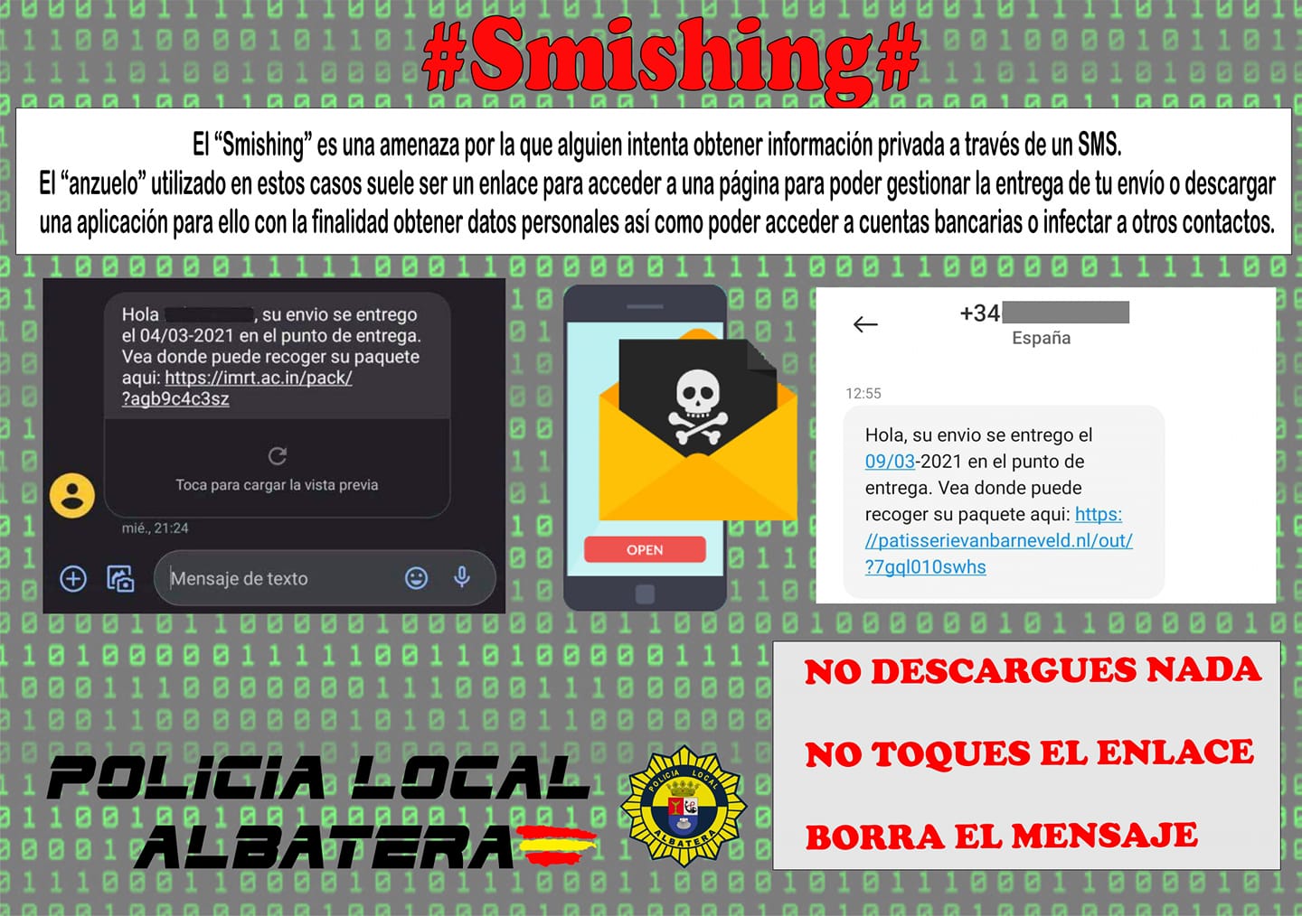 La Policía Local de Albatera ha alertado de una campaña de #smishing sobre empresas de mensajería. Esta actividad, señalan los agentes, consiste en el envío de mensajes de texto SMS haciéndose pasar por empresas de mensajería solicitando que pulses un enlace para poder gestionar la entrega de tu envío.
