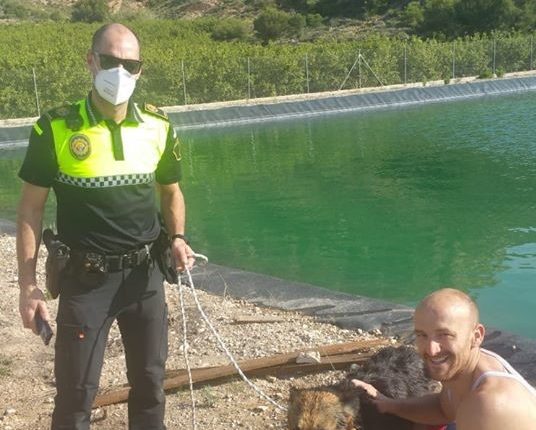 Este domingo 3 de mayo, los agentes de la Policía Local de Albatera, recibieron la llamada de un ciclista alertándoles que un perro había caído en el interior de una balsa ubicada en el Camino de la Sal.