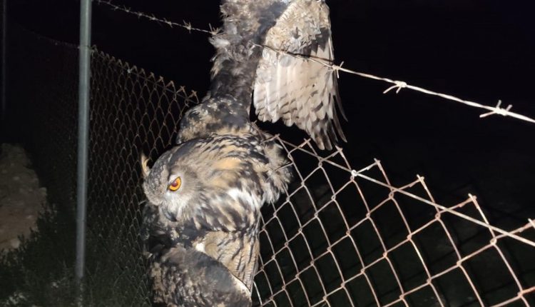 La Policía Local de Albatera ha recibido en la tarde noche de hoy, miércoles, 2 de octubre, la llamada de un vecino de la partida rural La Dehesa de Albatera alertando de la presencia de un búho real enganchado en un valla.