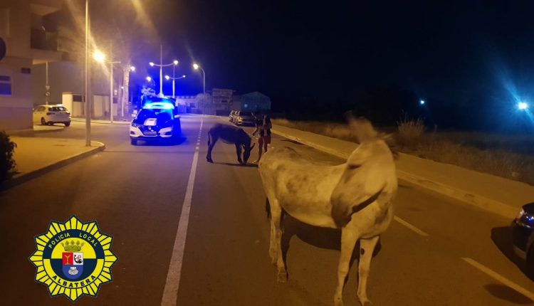 Fueron muchas las llamadas que recibió la Policía Local de Albatera indicándoles que andaban dos burros  merodeando por la Avenida de la Libertad.  Ante la incredulidad de las llamadas, se desplazaron los agentes hasta el lugar indicado,  pudiendo comprobar que  habían dos burros merodeando tranquilamente  por dicha avenida con el consiguiente peligro que podía tener para la circulación. Localizado el dueño, fueron devueltos a su cuadra.