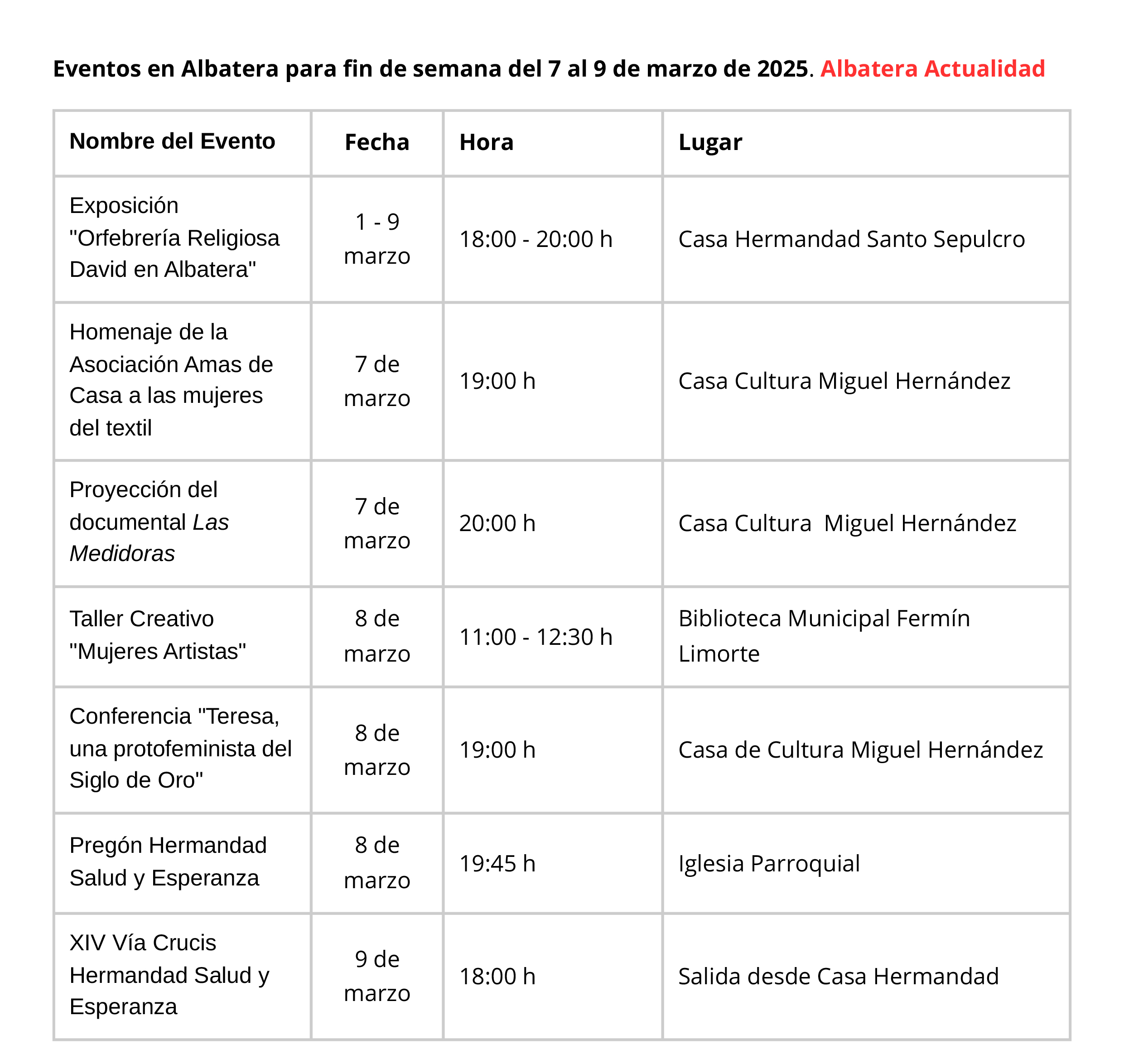 Aquí te dejamos un resumen de las actividades que se realizarán este fin de semana en nuestro municipio, del 7 al 9 de marzo. Todas ellas comprendidas entre el Día Internacional de la Mujer, el 8 de marzo, y el inicio de la Cuaresma previa a la Semana Santa 2025.