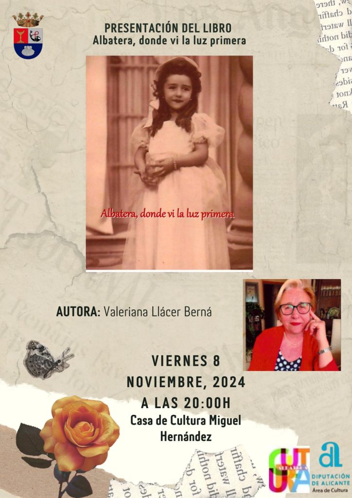 Comenzando por el viernes, 8 de noviembre, la escritora local Valeriana Llácer presenta su nueva obra «Albatera, donde vi la luz primera». Será en la Casa de Cultura Miguel Hernández a las 20:00 horas.