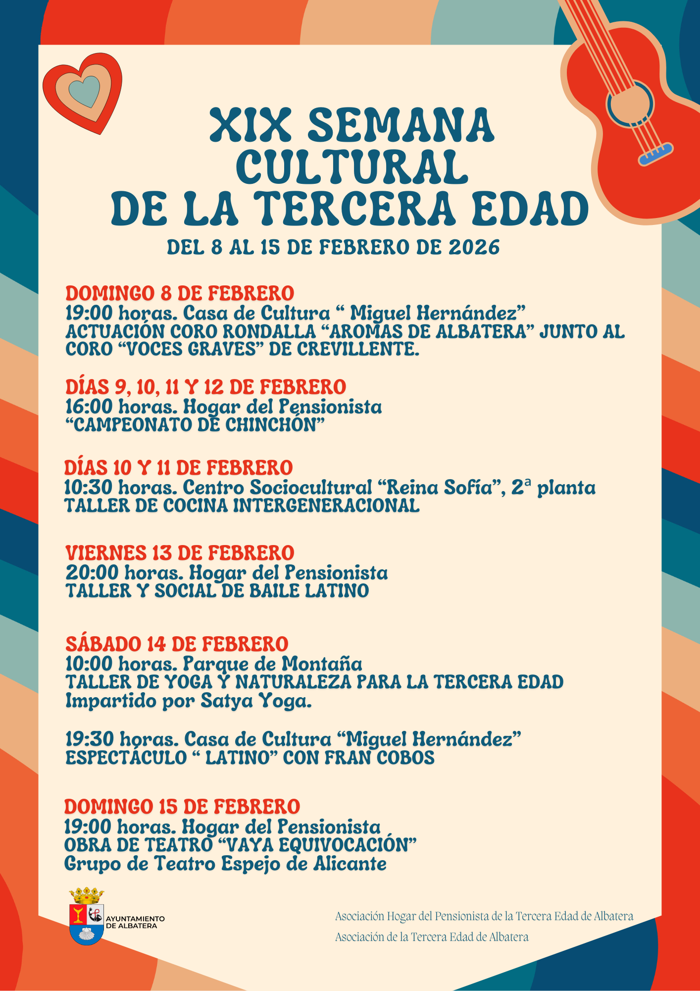 Albatera celebra del 8 al 15 de febrero una nueva edición de su tradicional Semana Cultural de la Tercera Edad, una cita que cumple ya diecinueve años poniendo en valor la participación activa de las personas mayores en la vida social y cultural del municipio.