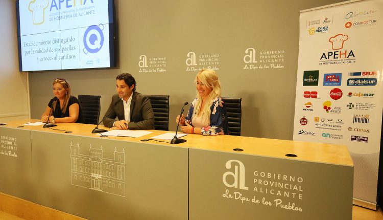 El vicepresidente y diputado de Promoción Turística, Eduardo Dolón, la presidenta de APEHA, María del Mar Valera, y la concejal de Comercio, Hostelería, Consumo y Mercados de Alicante, Marisa Gayo, han presentado esta mañana todos los detalles de este prestigioso sello que otorgará un comité de expertos en función del sabor, la textura, la temperatura y el aspecto de este tradicional plato.