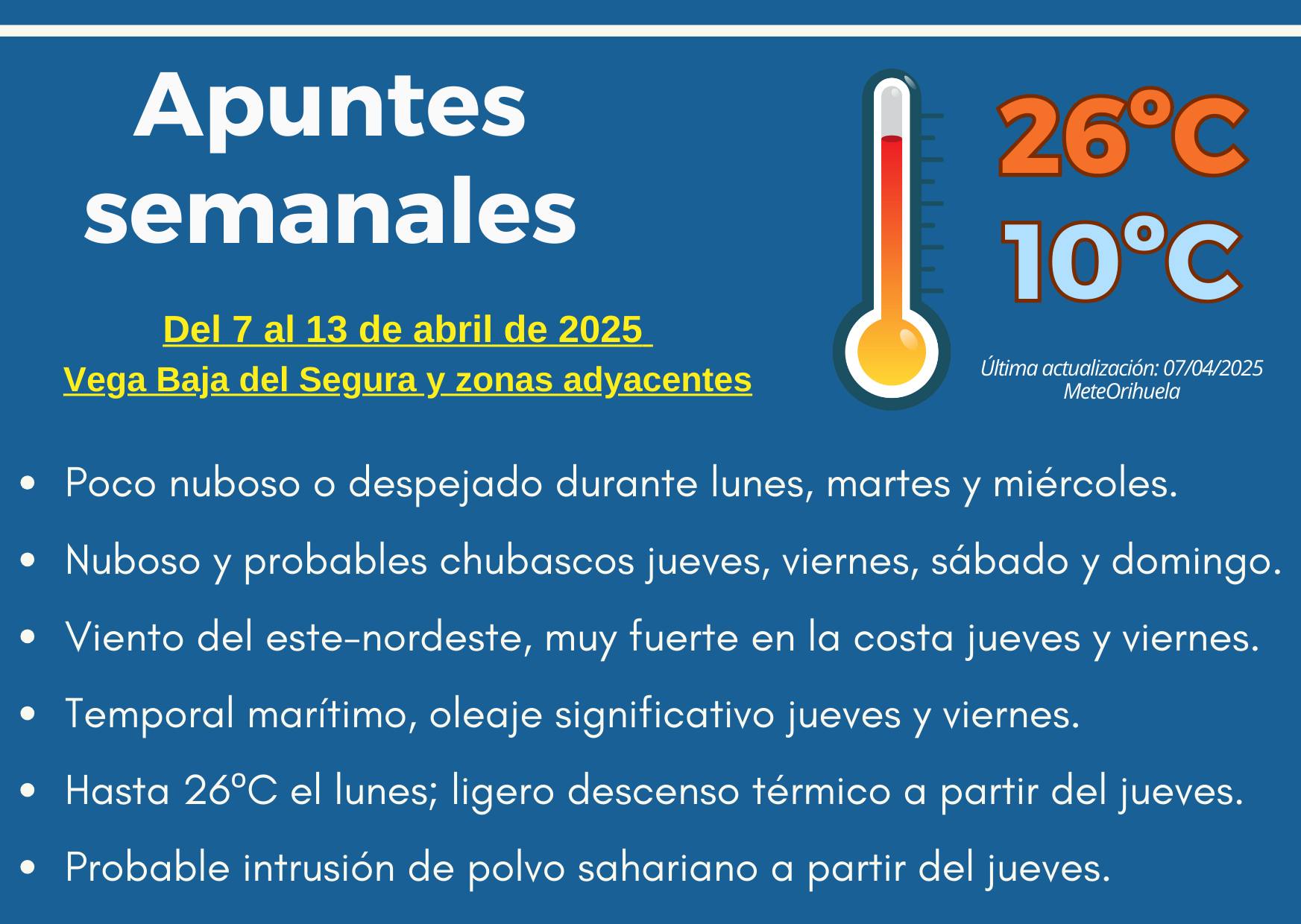 MeteOrihuela nos ofrece los apuntes meteorológicos semanales, del 7 al 13 de abril, en la comarca de la Vega Baja: