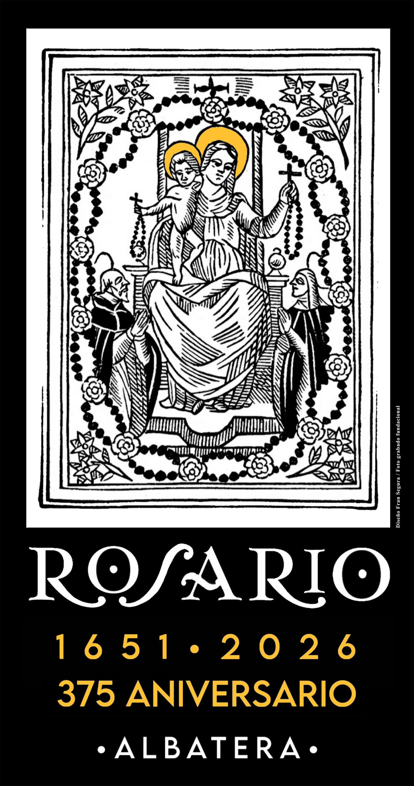 El cartel del 375 aniversario está protagonizado por el documento gráfico más antiguo que se conserva en Albatera en el que aparece representada la Virgen del Rosario: el grabado incluido en el acta fundacional firmada el 7 de marzo de 1651 en el Convento de Predicadores de Valencia, un valioso documento que se conserva en el archivo parroquial.