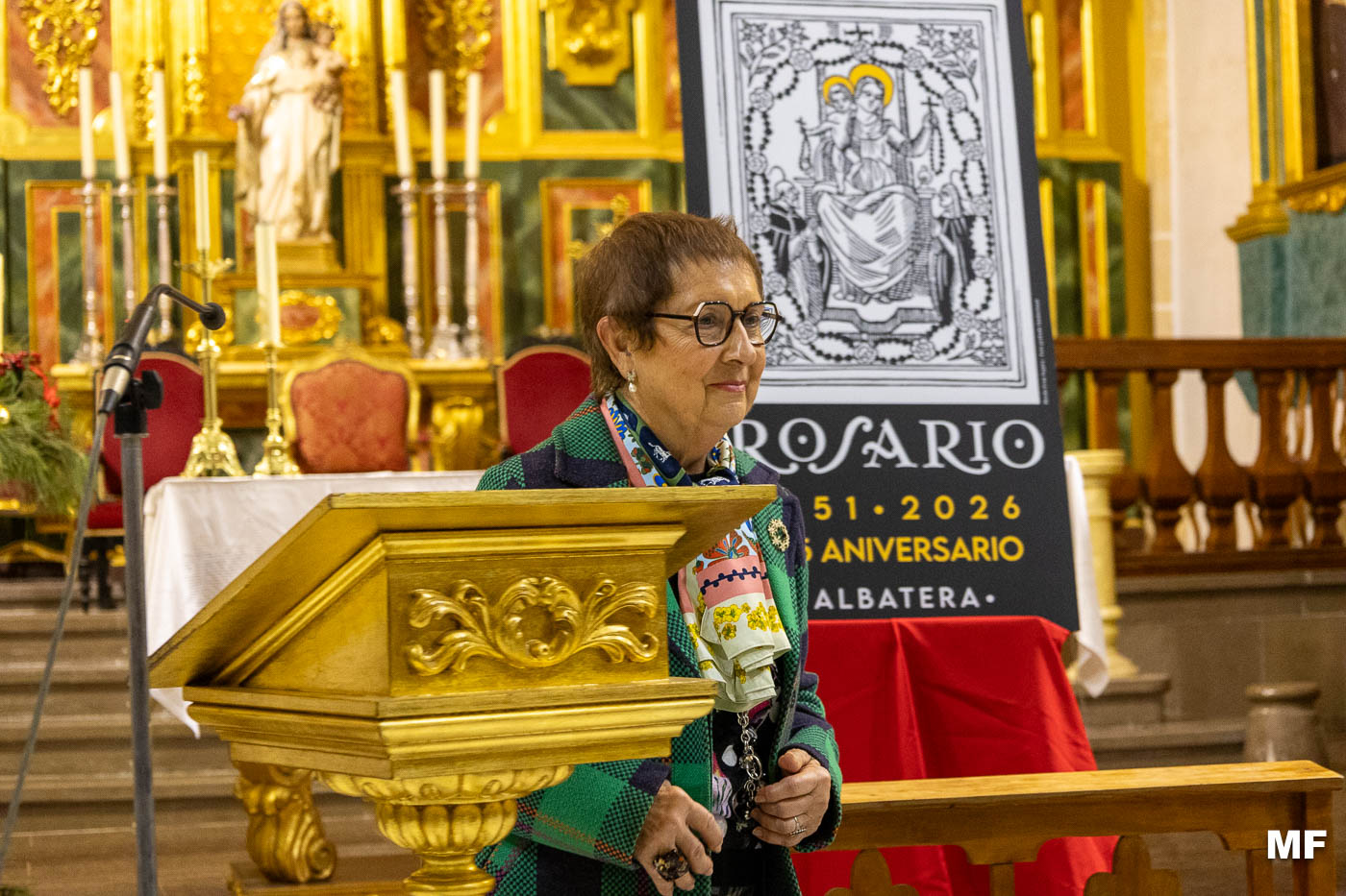 El acto fue presentado por Fran Segura, autor también del cartel conmemorativo, y contó con la presencia de José Francisco Teruel, párroco de Albatera; Encarna Serna Berná, Hermana Mayor de la Virgen del Rosario; Ana Serna, alcaldesa de Albatera, así como numerosos vecinos y vecinas que quisieron acompañar a la Hermandad en este anuncio tan significativo.
