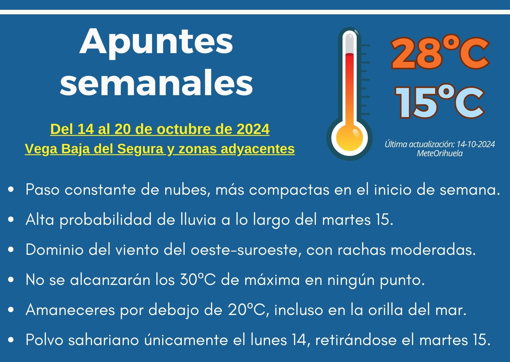 Previsión meteorológica para la Vega Baja y alrededores: semana del 14 al 20 de octubre 2024