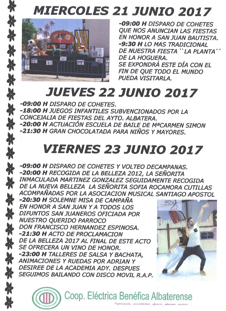 Con la llegada del verano el día 21 de junio llegan también hasta Albatera las fiestas en honor a San Juan Bautista. Los días 21, 22, 23, 24 y 25 la calle San Juan espera a todos los vecinos del pueblo para disfrutar de esta fiesta tradicional tan esperada por todos. Este año cuentan con multitud de actos, como talleres de salsa y bachata, coronación de la Belleza 2017, el gran desfile de disfraces y la actuación del ballet de Mª Carmen Simón, sin olvidar por supuesto el acto más representativo de la fiesta: La Hoguera. El miércoles 21 será la “plantá” y a las 00:00 del sábado 24 será la tradicional “quemá”.