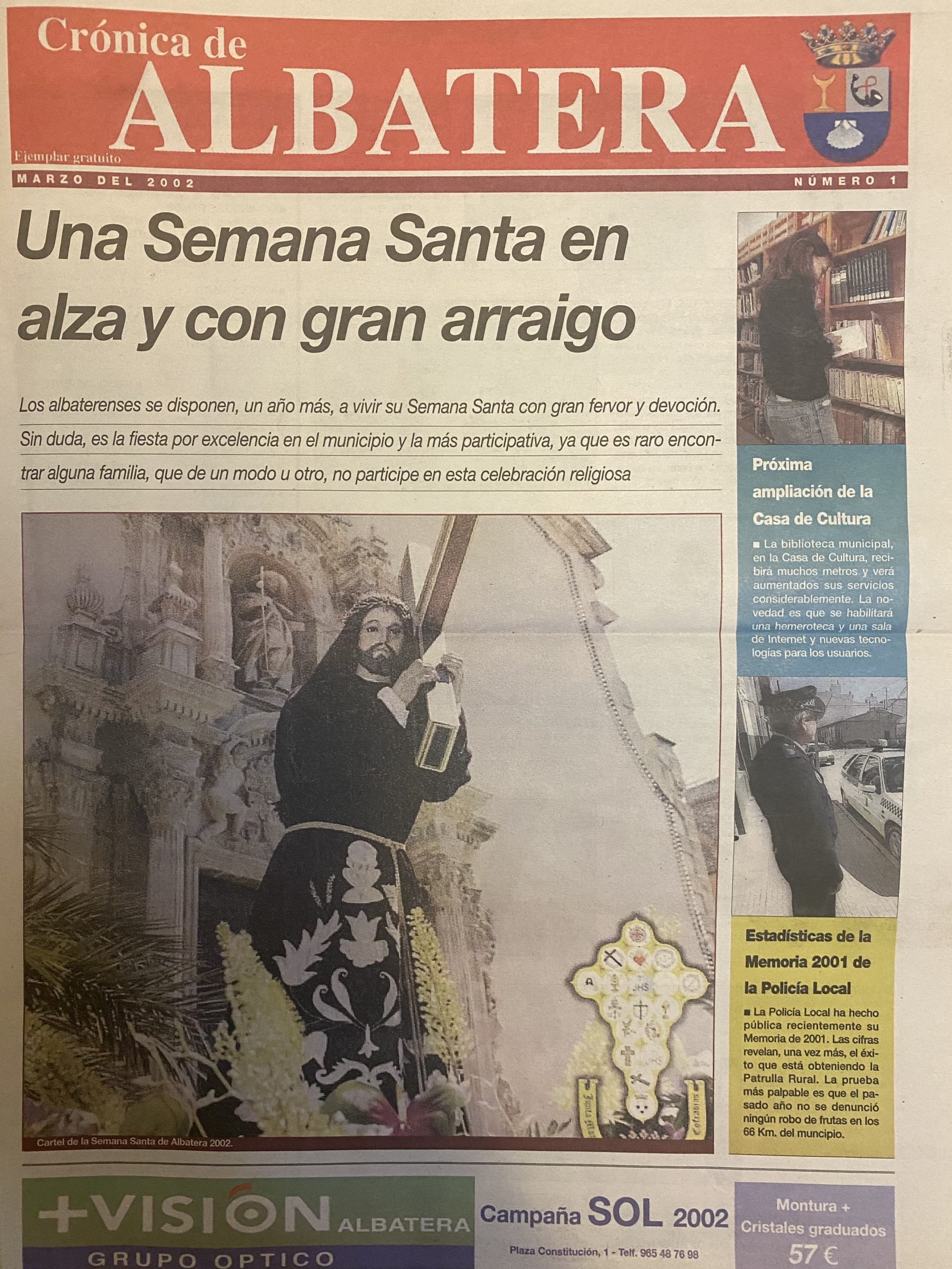 En 2002, Albatera iniciaba el proyecto de comunicar las noticias más destacables de la localidad a través de un periódico mensual, «Crónica de Albatera». El primer ejemplar salió en marzo de 2002, hace 24 años, estas eran las noticias más destacables en Albatera: