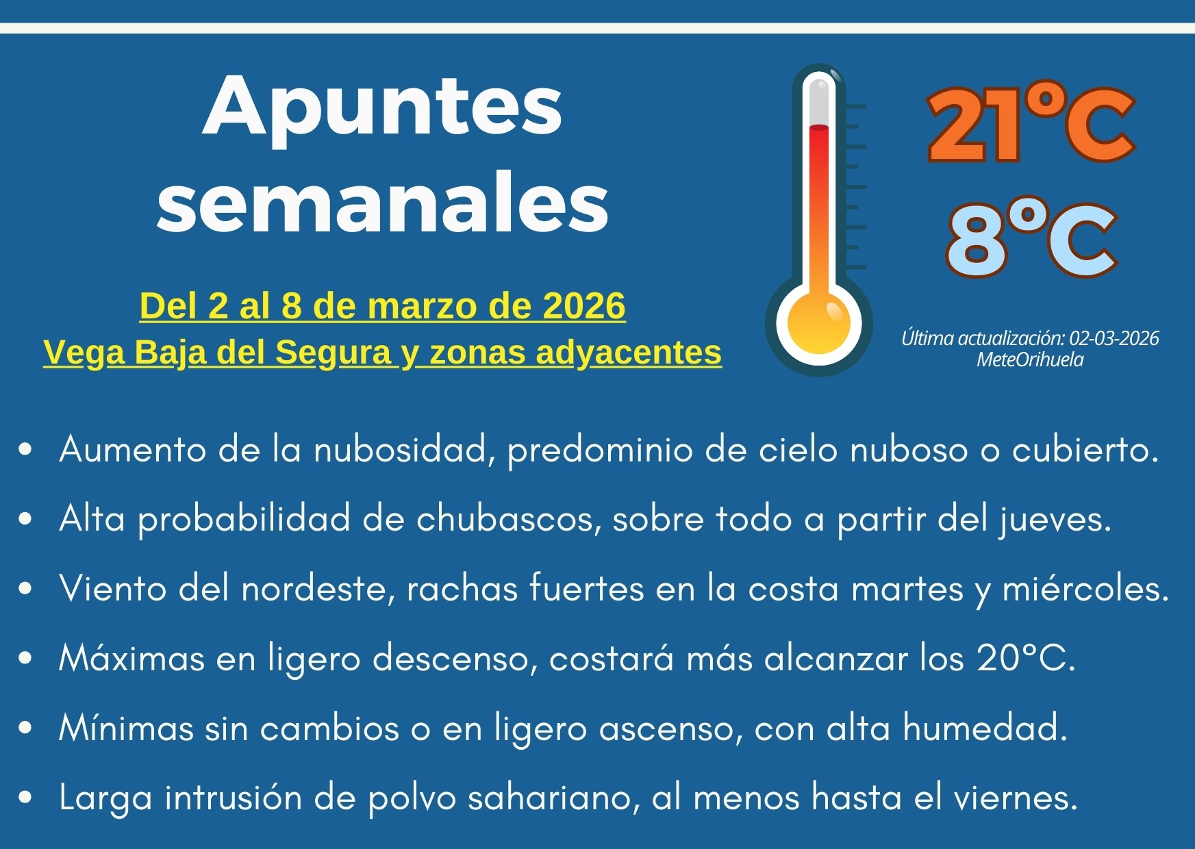 Albatera afronta la semana del 2 al 8 de marzo con un cambio notable en la situación meteorológica debido a la influencia de la borrasca Regina, que tendrá un impacto destacado en la población, así lo ha adelantado nuestro compañero de MeteOrihuela.