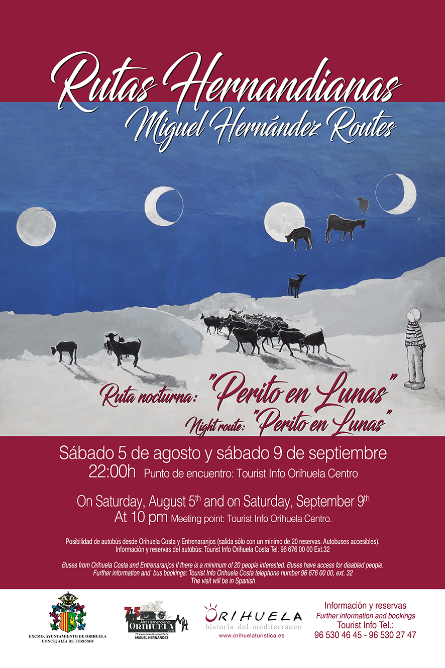 Este sábado 9 de septiembre, está programa la segunda ruta nocturna, llamada «Perito en Lunas» en honor al primer libro de poesía que publicó Miguel Hernández. Este itinerario es el cuarto de los cuatro que forman parte de la Ruta Hernandiana porque se hace una noche de luna llena. Este recorrido por las calles del centro histórico de Orihuela es una síntesis de los tres primeros. Engloba una visión general de la vida y obra de Miguel, desde su infancia hasta su muerte en el Reformatorio de Adultos de Alicante, con representaciones de su obra en las plazas más emblemáticas del recorrido y lectura de sus poemas bajo la luz de la luna llena.