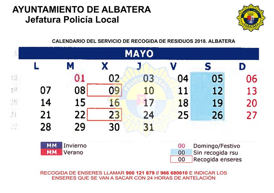 Como cada mes la Policía Local de Albatera nos facilita el calendario de las farmacias de guardia y el de recogida de basuras y enseres.
