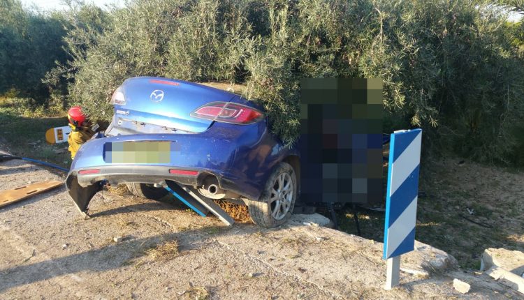 Un vehículo, Mazda con matrícula inglesa, con dos ocupantes, se ha salido de la calzada en la primera curva que hay al final de la recta de salida de Albatera dirección Hondón de los Frailes impactando brutalmente contra las oliveras del huerto que hay en la curva.