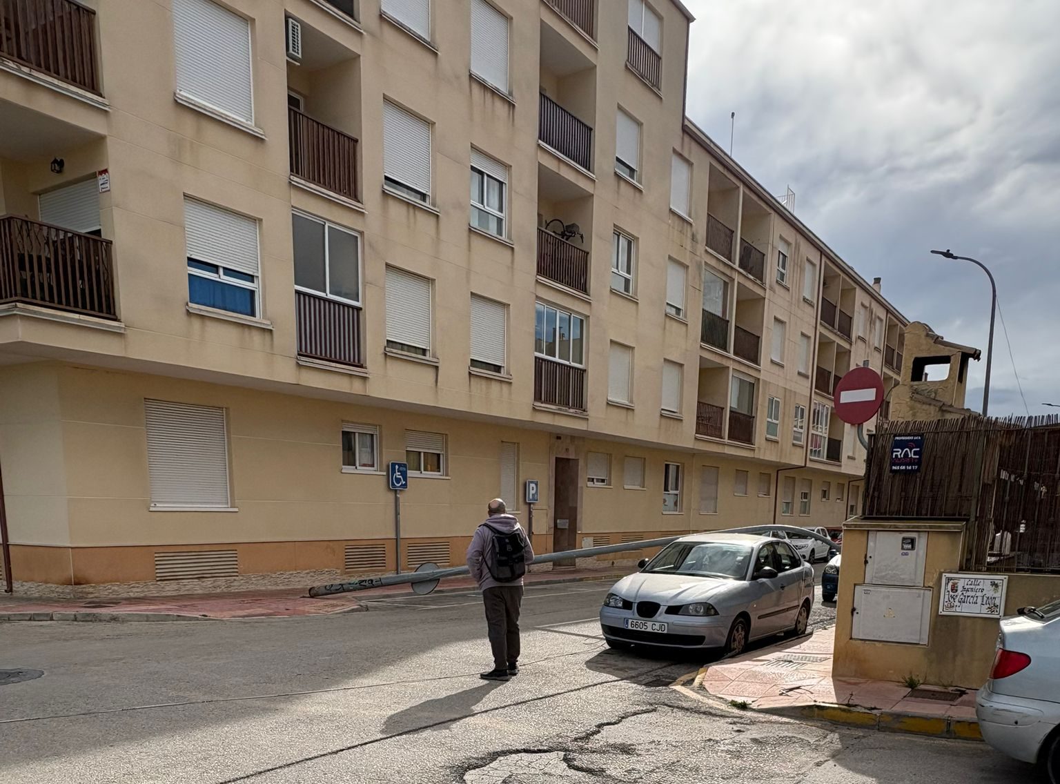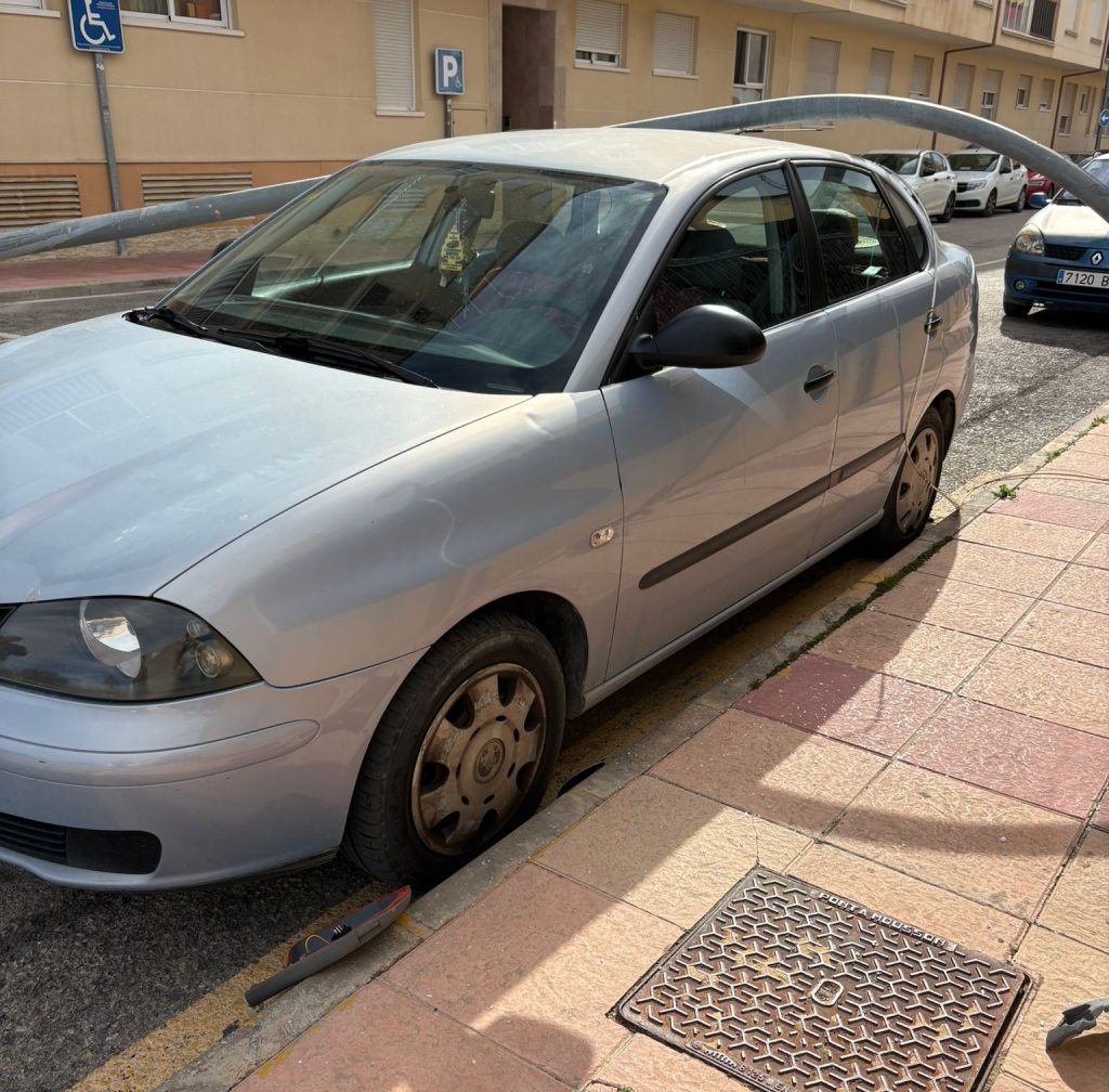 La farola no se ha doblado ni arrancado parcialmente: ha caído completamente a plomo, seccionada prácticamente a ras del suelo, justo en el punto donde el metal se une a la base de obra.